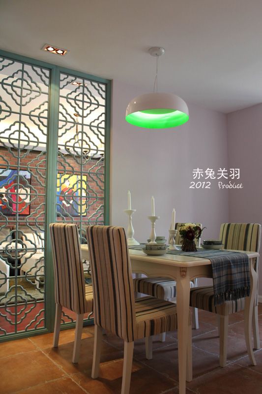 业主同意我的意见,而且他们说他们也不经常做饭。为了保证餐厅的整体感觉,我在墙面的处理上大面积是刷乳胶漆的,只是在灶台和水槽的位置墙面是贴的仿古砖,其用意是弱化厨房的感觉,强化餐厅的完整性。