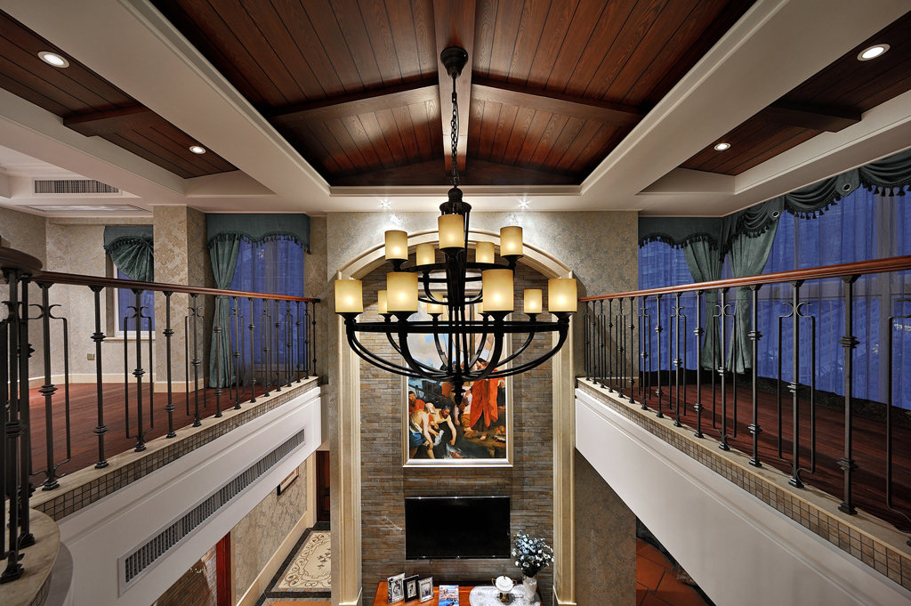 连接两个楼层的是旋转楼梯,弧形的设计让室内的转折有所缓冲,在视觉上也带来宏观的美感。二楼的过渡区域再从细节上体现文化的根基。与一楼相呼应的宗教装饰,同风格灯饰,一气呵成的木质装饰,令纯正的美式文化深入其中。装饰风格与精神内涵相辅相成,最大化的彰显文化资产者精神领域的追求。
