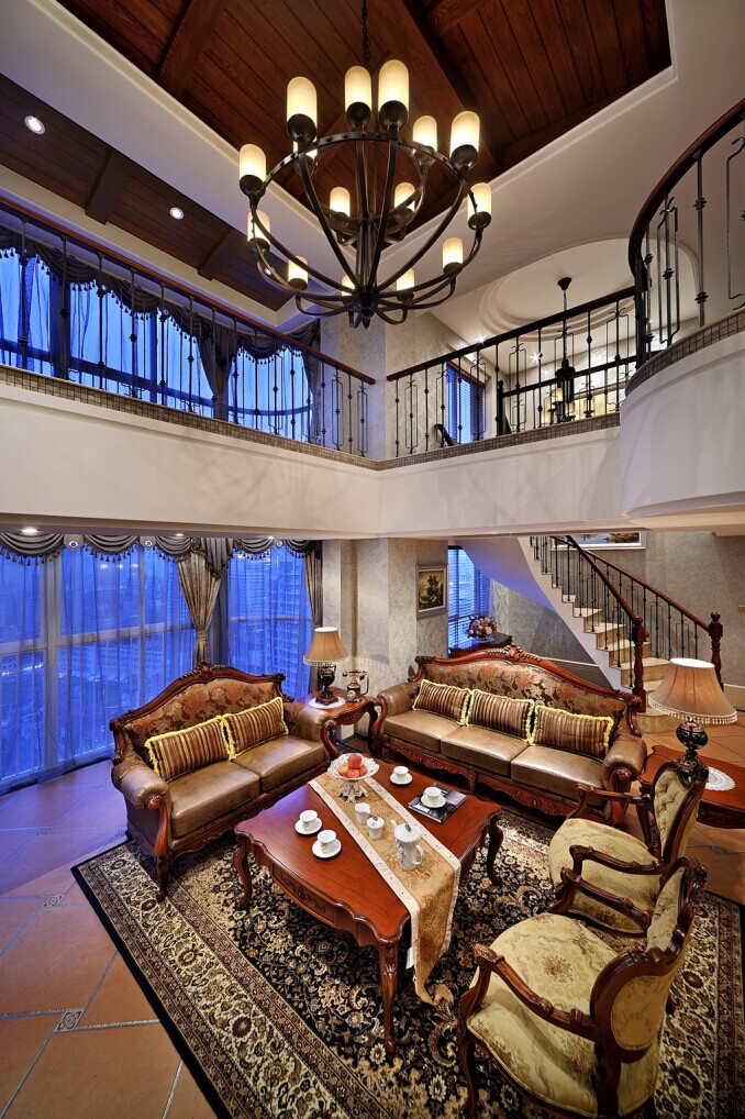 本案为美式风格的复式大宅,设计师基于对古典主义新的认识,强调简洁明晰的线条和优雅适度的装饰。空间之内既有欧罗巴的奢侈大气,又因应着自由不羁的生活态度而剔除了繁冗的羁绊,在贵重的怀旧气息之下又多了一份生活的自在和随意。 进入240平的主题空间首先感受到的是它富有文化气息的一面。宽敞明亮的客厅为复式结构,上下两层的落地窗最大限度地引进户外的光线,又与文化石墙面相映成趣。设计师简化墙体设计,在栏杆上选用复古的铁艺,让空间在围合的结构下也显得落落大方。简练的铁艺,田园的墙布,素朴的布艺,仿岩壁的设计,这些轻松写意的元素组成呈现出的是美式乡村风格的休闲做派。