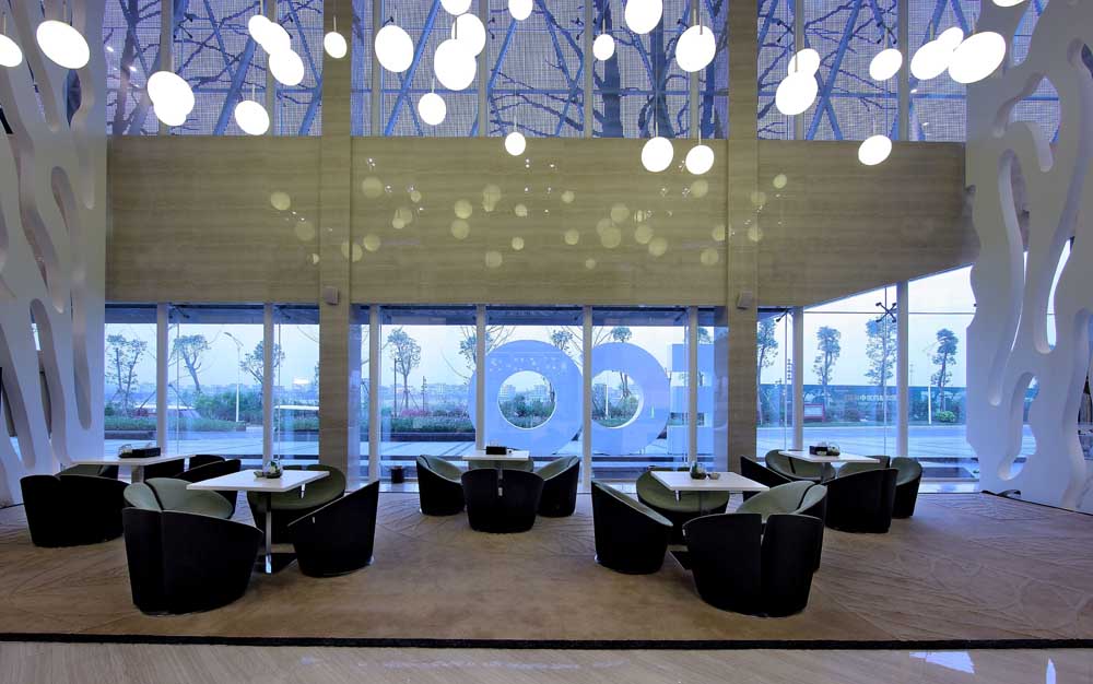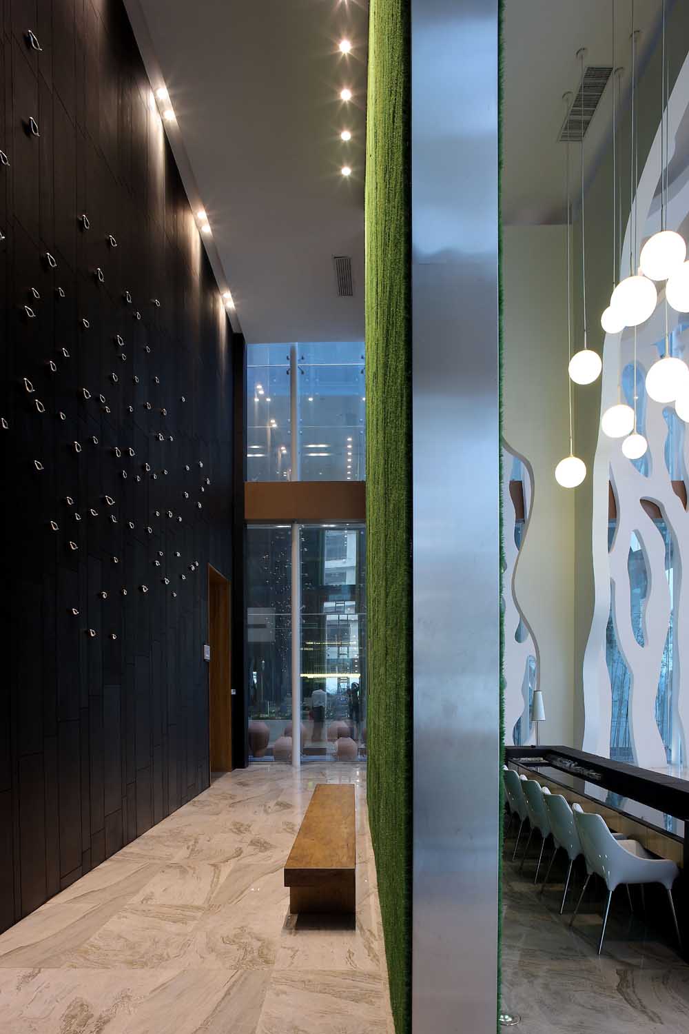 没有中空的水晶吊灯,也没有欧式的罗马立柱,只有流淌的线条及柔和的灯光相互穿插,动感细腻的家具形体与简约纹理的科技版交织一起,在地面上折射出的不再是浮华。绿色草皮的使用让钢筋水泥般的空间顿时具备了呼吸姿态,不仅平衡了空气中的湿度和温恒,也具有很强的设计理念与创意。丰富而变化的设计元素弱化了环境的繁杂,仿佛所有的声音都被过滤掉了,只剩下属于城市的宁静和安然。