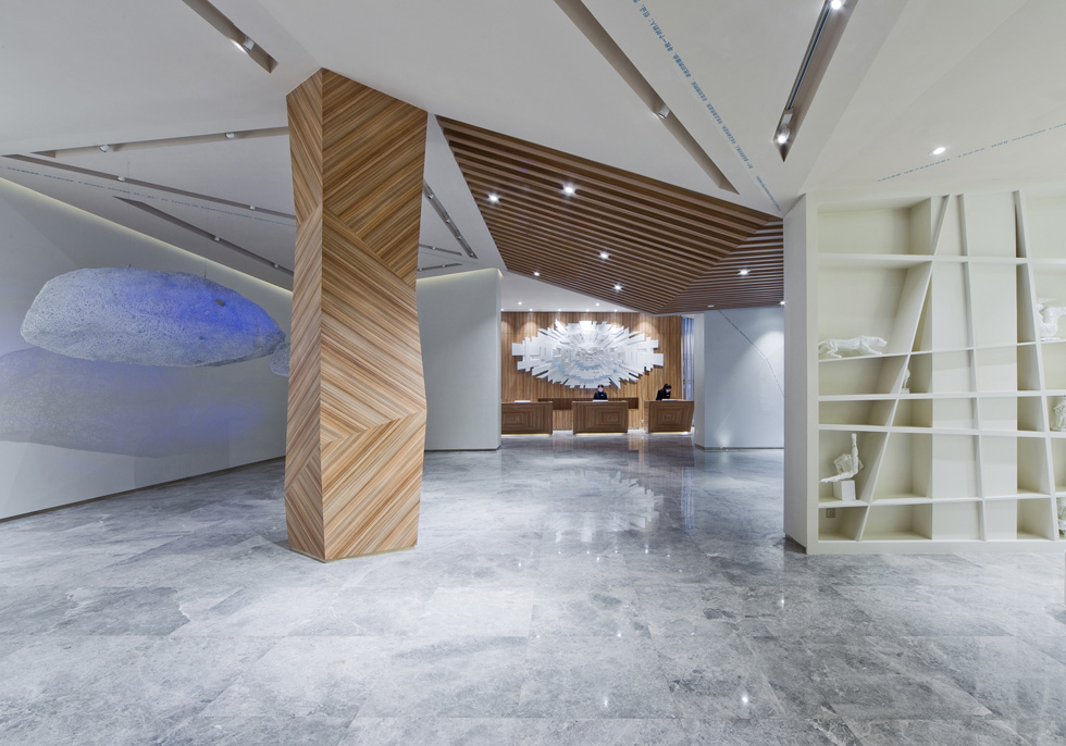 空间设计 入口大堂覆盖着如天空一般纯白色曲折的天花及墙面,上面细致的蓝色欢迎句将宾客从外界的繁嚣引领至一个抽象和宁静的接待空间。