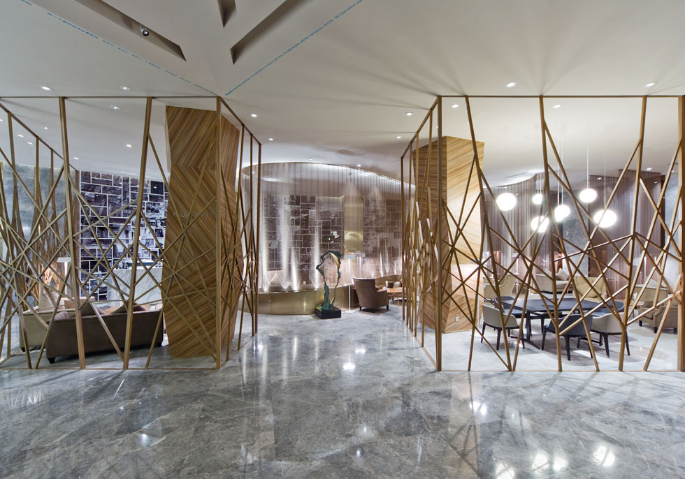 棕色调子的大堂吧提供商务洽谈及多功能活动的宴会配套功能,其树型木制屏风和流水般的铜制帘幕为宾客提供了不同私隐度的空间。