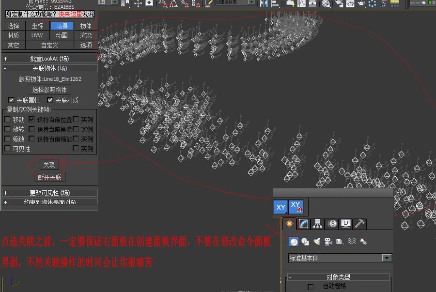 再全部选择小菱形体,注意点选关联之前,一定要保证右面板是创建命令面板,如果在修改命令面板状态下,关联命令执行的时间会让你很痛苦,