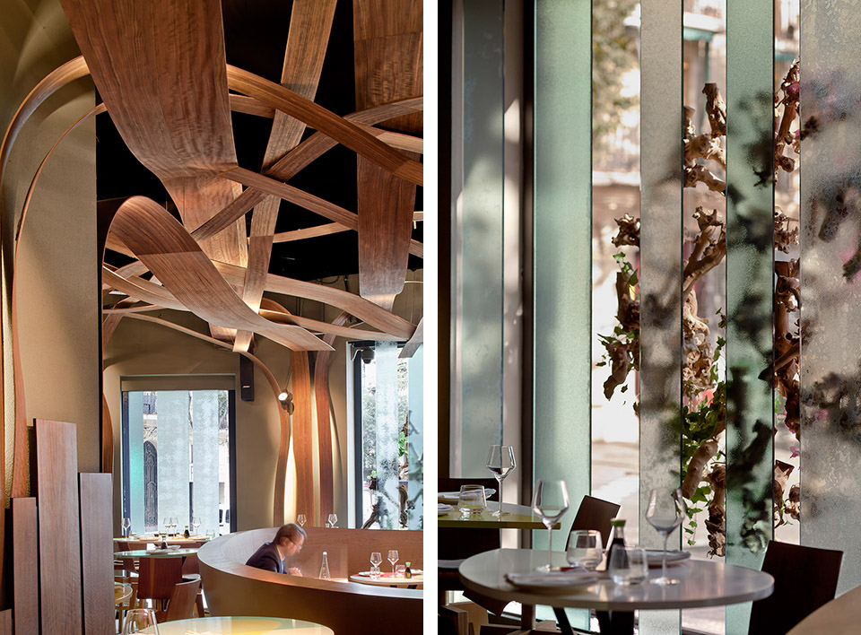 The Ikibana restaurant is a sinuous artificial landscape created by different program elements. Bars and kitchens are divided and distributed around the restaurant, creating intensity nodes spread throughout the space. Guests sit inside colorful islands embraced by a fluid space which meanders around the restaurant, producing infinite angles of vision and allowing the constant movement of the waiters presenting the food to liven the atmosphere. The vegetation inside the display windows works as a curtain that diffuses the light and the vision between the interior and the street, producing a cozier space. A roof built as a forest of entwined branches projects a warm tinkling of lights and shadows on every surface. In a lower proportion, but not less important, the necessary color element in the Ikebana arrangements comes with the tables. Their design brings an explosion of fresh and tropical colors: lemon yellow, lime green, passion red. Its organic shape reminds us of a petal and can be easily adapted for larger groups, producing a new color composition with each new table arrangement.