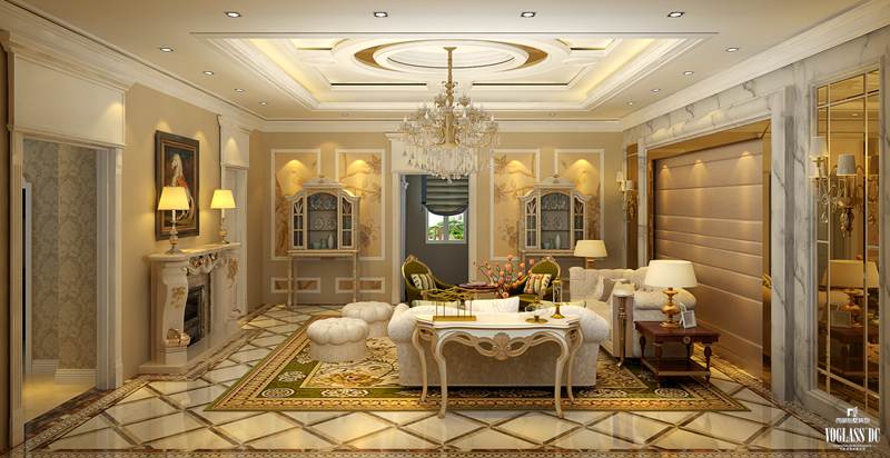 典型的欧式风格装修体现出典雅的气息,选用进口的大理石运用经典的菱形格大理石拼花点缀了整个客厅空间,这种地面拼花的工艺相当费时费料费力,客厅的镀金膜玻璃设计不仅为空间平添了奢华的元素同时也有延伸空间的效果。吊顶采用简化后的欧洲皇家宫廷纹路设计。整体的设计风格让身在其中的您可以体验到真正的欧洲大宅设计,同时不会有太繁重的宫廷风格。