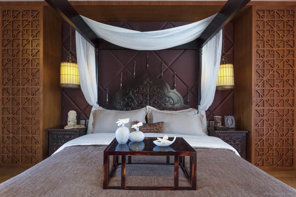 3F:主卧室与起居室由半通透的隔断将两个空间分开,和墙面材料形成虚实的对比。搭配深色的家具,丝绸质感和亚麻的布料,结合光影的变化,使居室散发着淡淡的温馨与悠悠的禅韵。