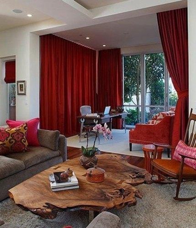 不想设立墙体,因为觉得太麻烦或成本太高,那就给所要划分出的区域配置一条布帘巧设软隔断,就像案例中这样,红色的布帘与书房的红色装饰也极为匹配。工作时只需将布帘拉起,就能得到独立又安静的工作学习时间了。