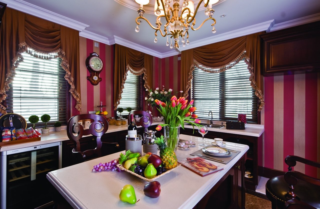 别墅二楼共包括三间客房与一间主卧室,其中一间客房完全是“青花”的写照。房间的墙面被涂以蓝灰色,经典而纯粹的蓝白搭配显得素雅而宁静。白色绸缎材质的窗帘甘当绿叶,只为衬托出印有繁复花草纹图案的床品,以及充满异域风情的几何纹样地毯。墙面上,仅仅挂着一个精美的青花瓷盘,却妙笔生辉。天花处的烛形吊灯以青花瓷盘托起,宛如一件艺术品。整个房间,充盈着一种中国水墨画般的飘逸和空灵。