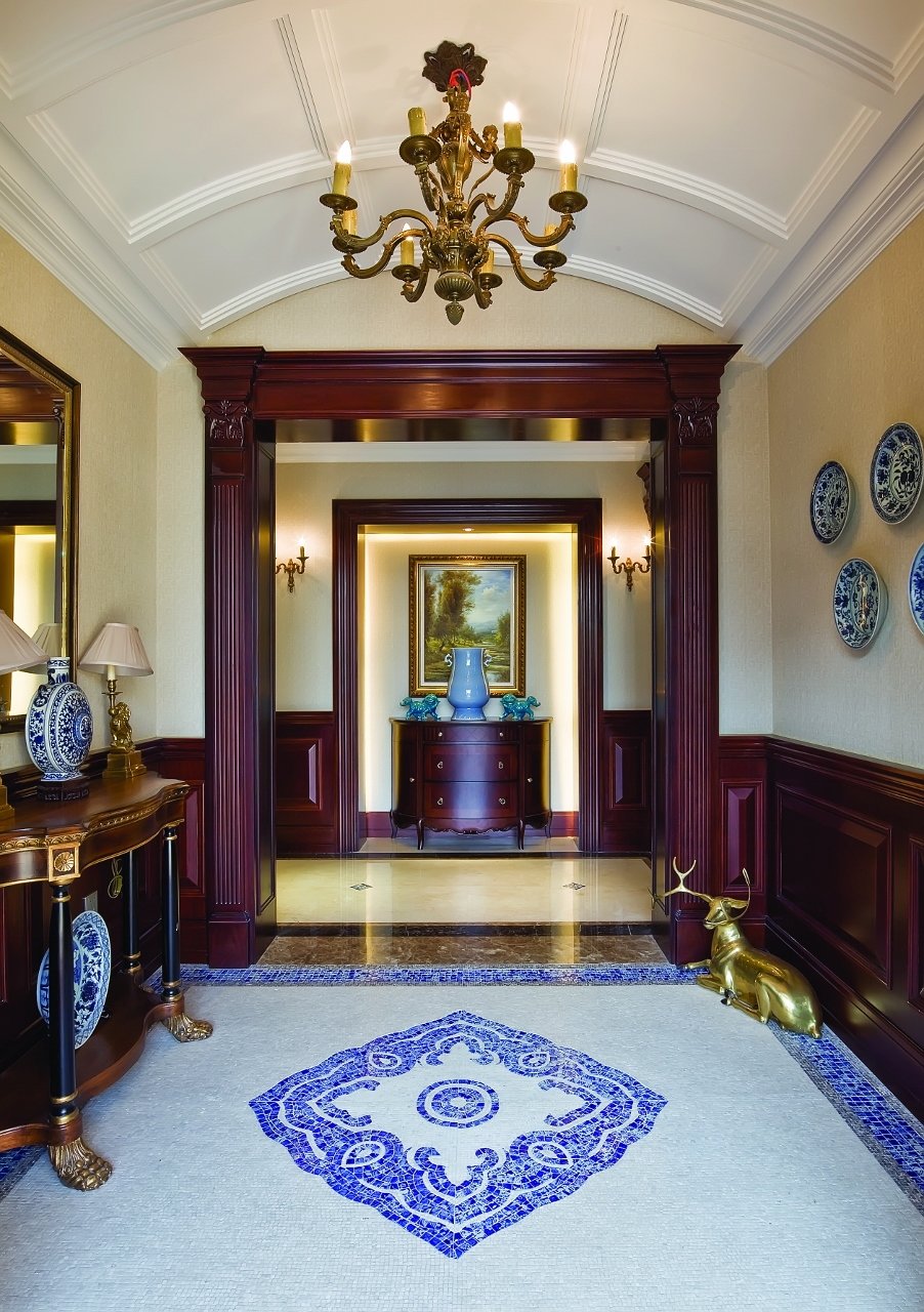 除了陈设的青花瓷器外,本案的装饰也始终围绕着“青花”二字。挑高至二楼的客厅内,如瀑布般印有青花图腾的垂地帘幔令人怦然心动,尤其是帘头的样式,设计师特地按照青花瓷的经典图案定制,与瓷器一脉相承,完美呼应。米色布艺沙发上的靠垫纹饰与窗帘如出一辙,相映成趣。稍浅一些的蓝白色地毯同样散发着典雅素净的韵味,就连客厅边几上的台灯,设计师也精心挑选了青花瓷样式的底托。而走廊地面上,用马赛克拼贴而成的经典“唐青花”阿拉伯图案纹饰——菱形图形中夹以散叶纹,更是将“青花”元素运用得精妙绝伦。