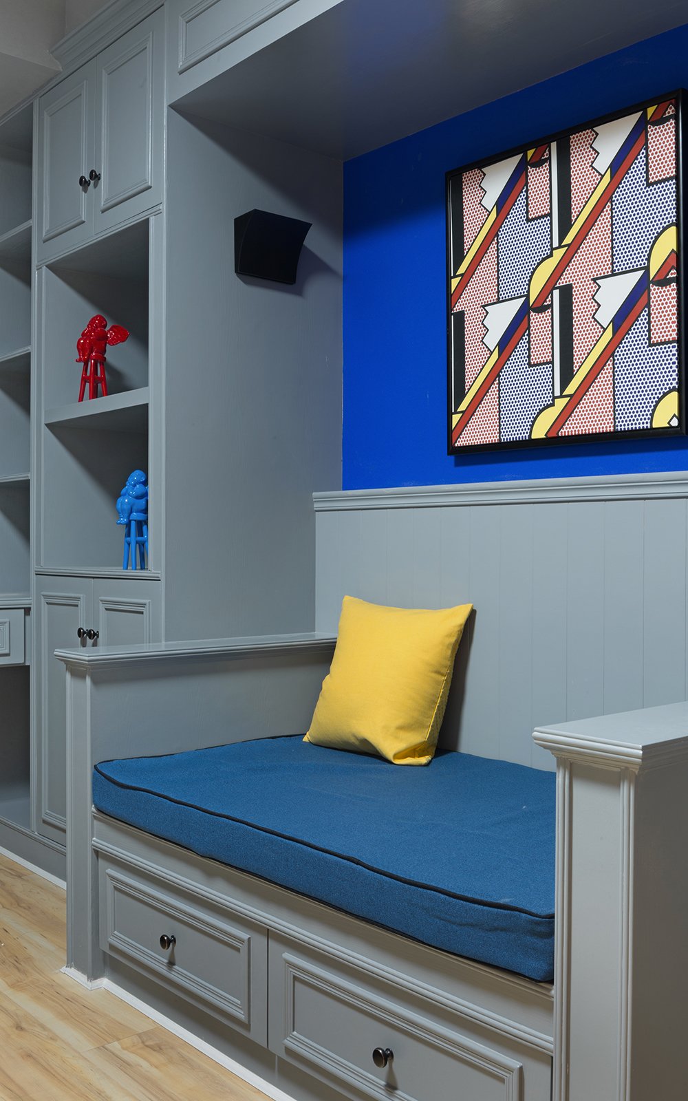 通过设计师的巧妙构思,以线条分层带动空间感官,配以不同的颜色营造出空间的层次感。将原有的空间结构得到合理有效的功能性运用,追求一种整体的平面化与局部的立体化,将两者保持在视觉的黄金平衡点上,造成一个空间错觉。