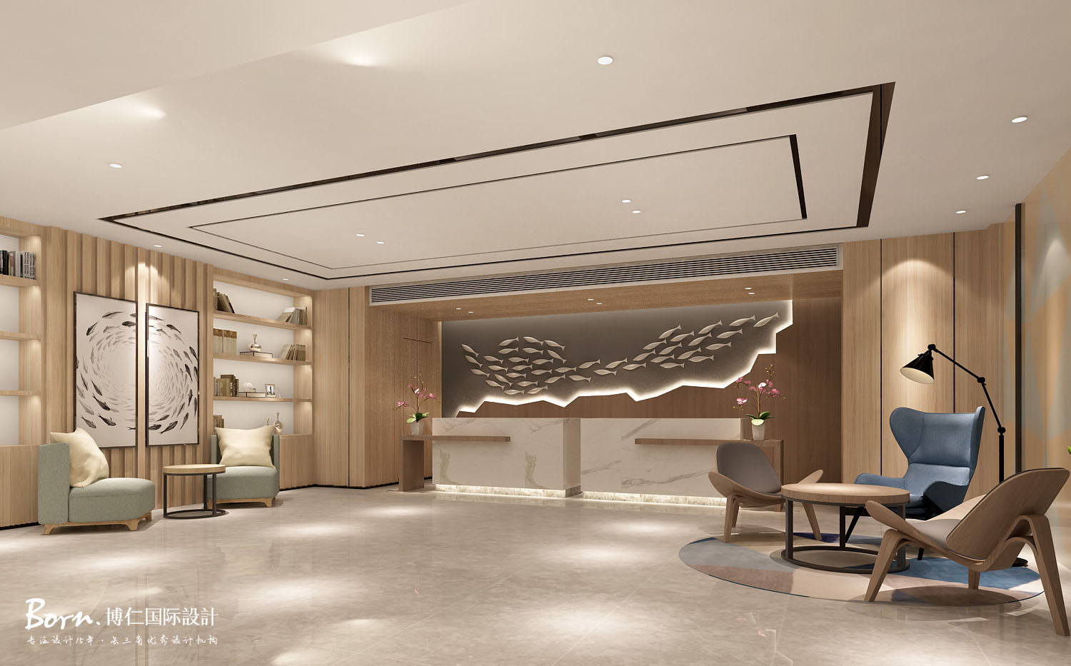 步入大厅,地面仿大理石花纹的乳白色瓷砖与墙面木质板材的结合,给予来宾非常舒适的视觉感受。墙面挂画回旋式鱼群和背景墙不规则形状的鱼群搭配,尽显空间的淡泊风格。精品酒店设计的顶面与墙面配以筒灯和灯带给人柔和温暖的感觉,仿佛清光皎洁的夜明珠【部分精品酒店设计空间展示】