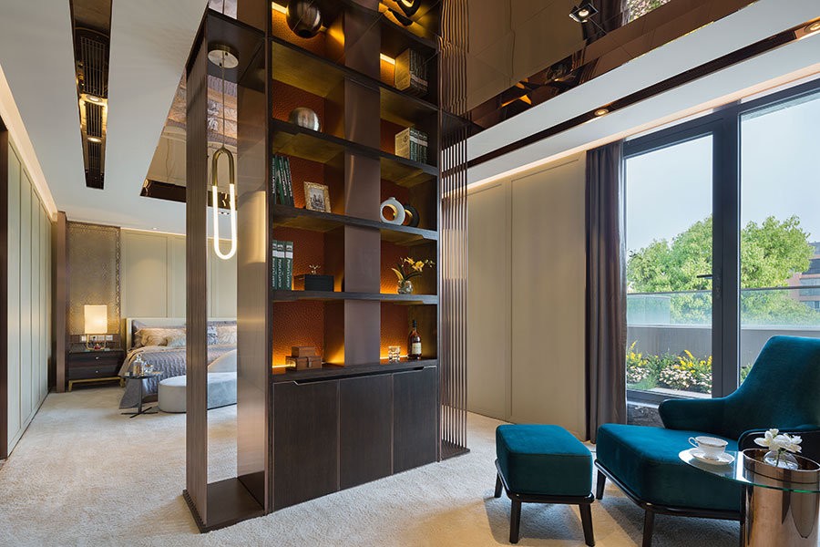 3F:主卧室与起居室由半通透的隔断将两个空间分开,和墙面材料形成虚实的对比。搭配深色的家具,丝绸质感和亚麻的布料,结合光影的变化,使居室散发着淡淡的温馨与悠悠的禅韵。