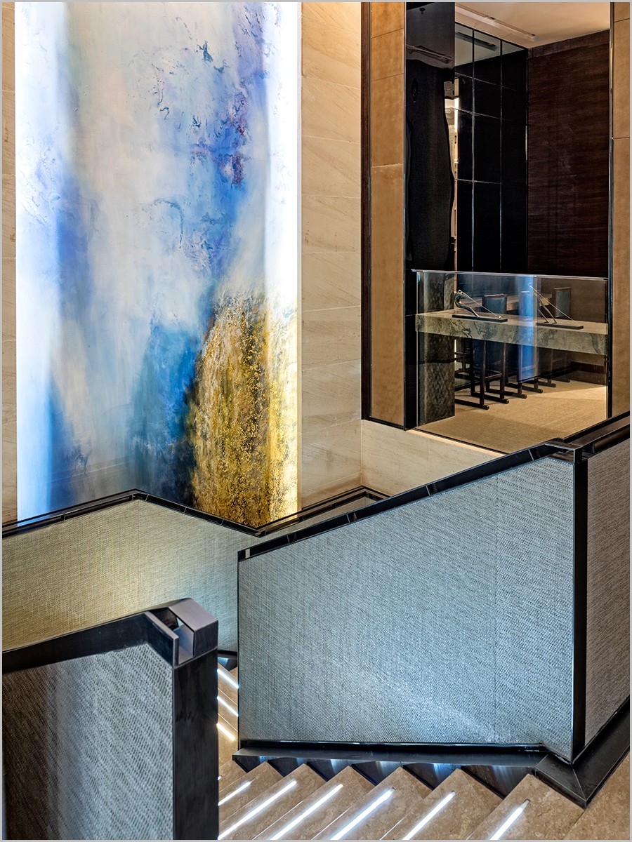 富有私密性的会所书吧一隅显露出端倪,宣告着大厅深处另有洞天,引人想要步入其中一探究竟。天花上雕刻出的抽象镂空的桃花枝坢,一路向前延展,顺着曲径弯折的楼梯,如同漫步山间小路,置身其中的人沿着桃花枝坢前行,起伏的护栏与台阶上的灯光兼具装饰与导览的功能。在地下一层,垂直贯穿如屏风似的光幕墙又带来“柳暗花明”豁然开朗的视野,令观者仿佛忽然身处另一个空间。