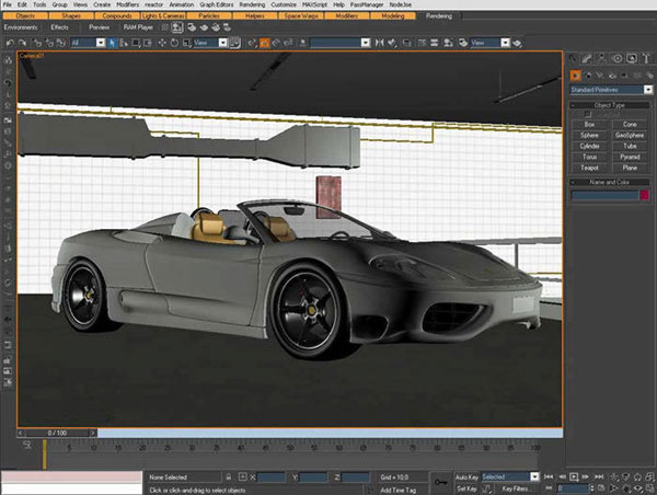 正如你们在上面看到的那样,这是最终的成图。我的机器配置是Dual Xeon 3 GHz的处理器以及2GB的内存,渲染这张图花费了我15分钟。下面这张图就是在3ds Max中这个场景的布局。