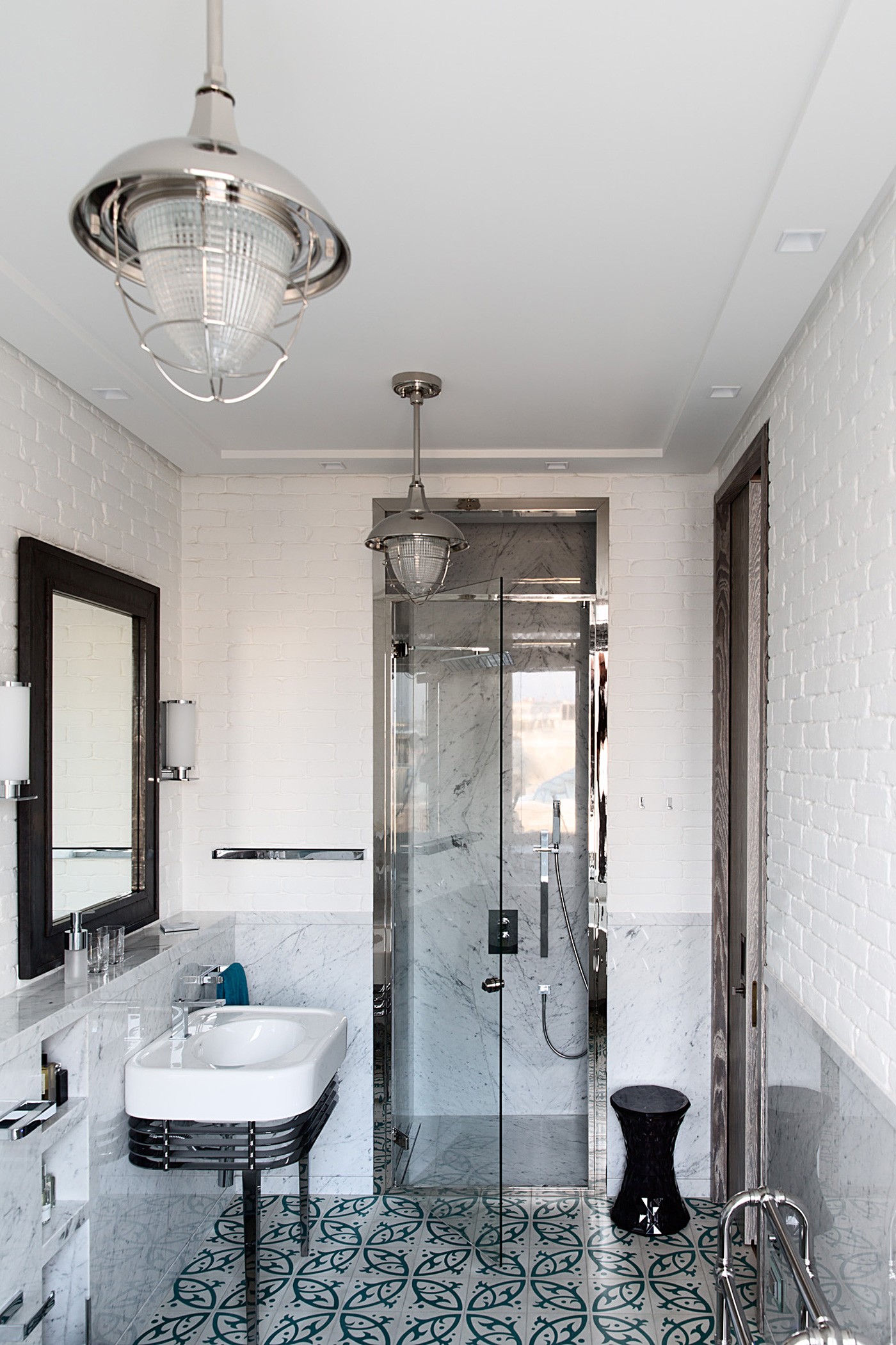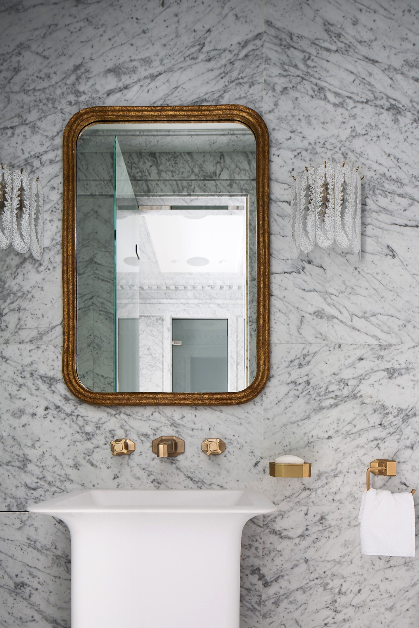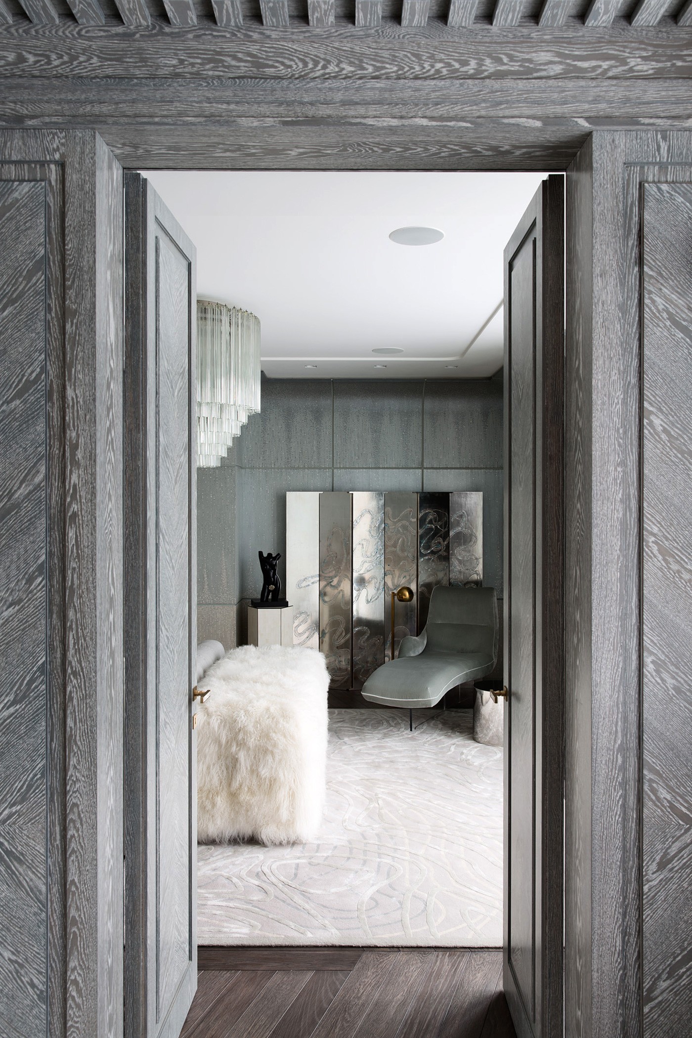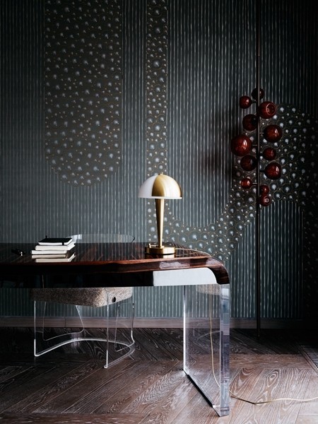 早年的Ekaterina Fedorchenko法语专业毕业, 推门进来, 位于莫斯科Ostozhenka大街的私宅其独特的 摩登又优雅的女性空间气质扑面而来。 (姑且叫女性空间吧,毕竟整体基调比较柔软, 尤其后面派对区域色系的处理。) Hervé Van der Straeten的Pirouette sconce壁灯 古铜材质的细腻门把手设计