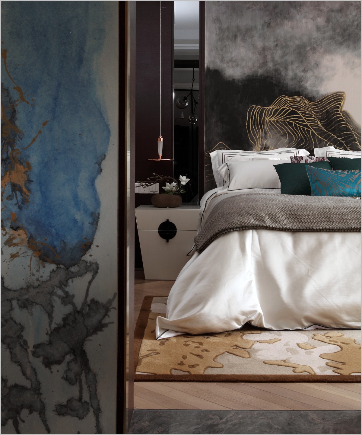 主卧用真丝手绘山水作床背景,静谧油然而生。蓝灰色调的点缀,简约的灯饰与中式家具相结合,加之硬装装饰有粗有细,有虚有实,赋予了空间节奏,犹如行云流水般。