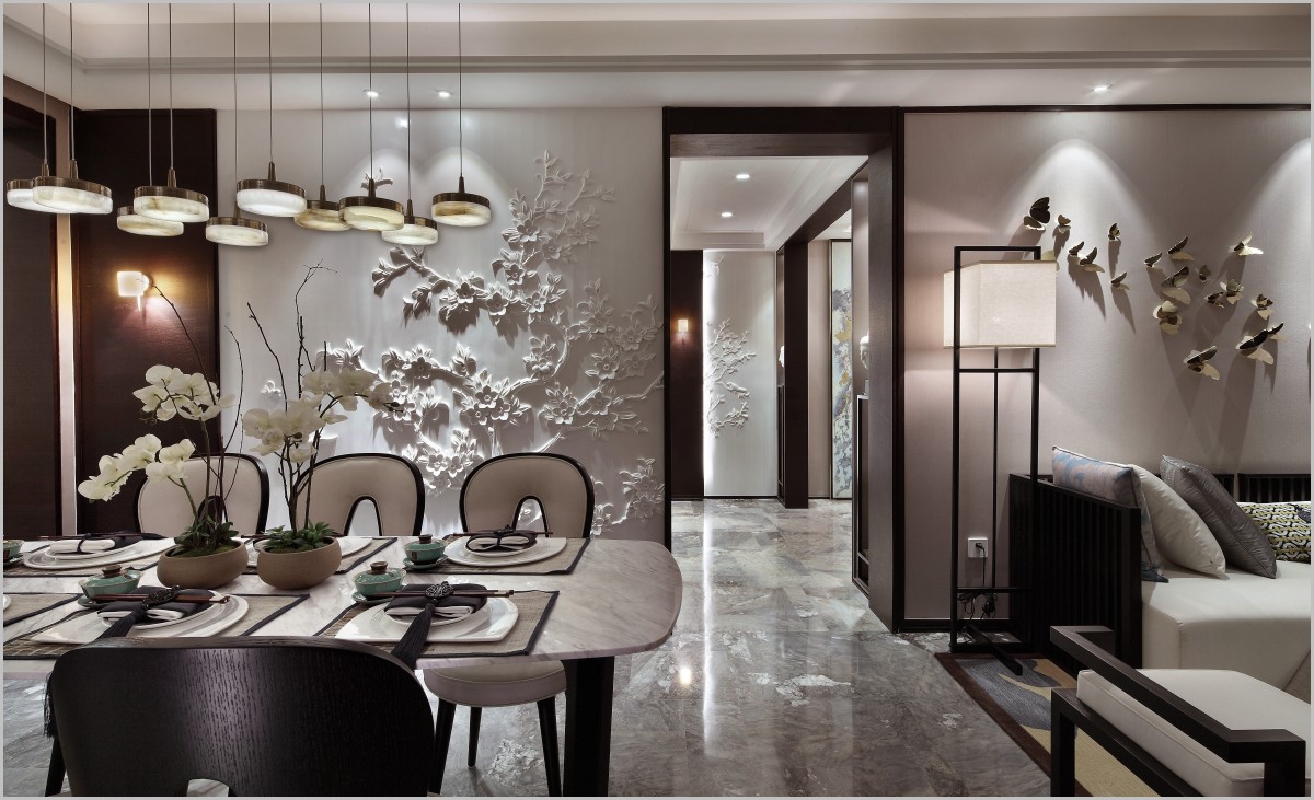 新中式风格在现代家居中渗透中式传统元素,以简约内敛、精致古典的独特魅力,将经典融入生活,传递空间力量。 无论是新中式家具,还是装饰与植物点缀,这种完美结合演绎出的独特韵味,都形成了一种家居新时尚。 客厅和餐厅贯穿,运用了冷灰色石材、暖灰色壁纸结合的高级灰大基调,内敛而低调。 餐厅背景提炼了重庆山茶花的元素雕刻了一面白色浮雕墙,和另一面蓝色手绘水纹呼应, 映衬出空间的恬谧娴静。客厅部分则用蝴蝶来点缀,瞬间让空间充满生意。