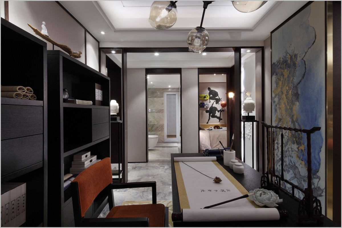 敞开式的书房,沉稳的木作、写意云水纹画作和现代简约灯饰的结合,让人有种“云深不知处”感觉。