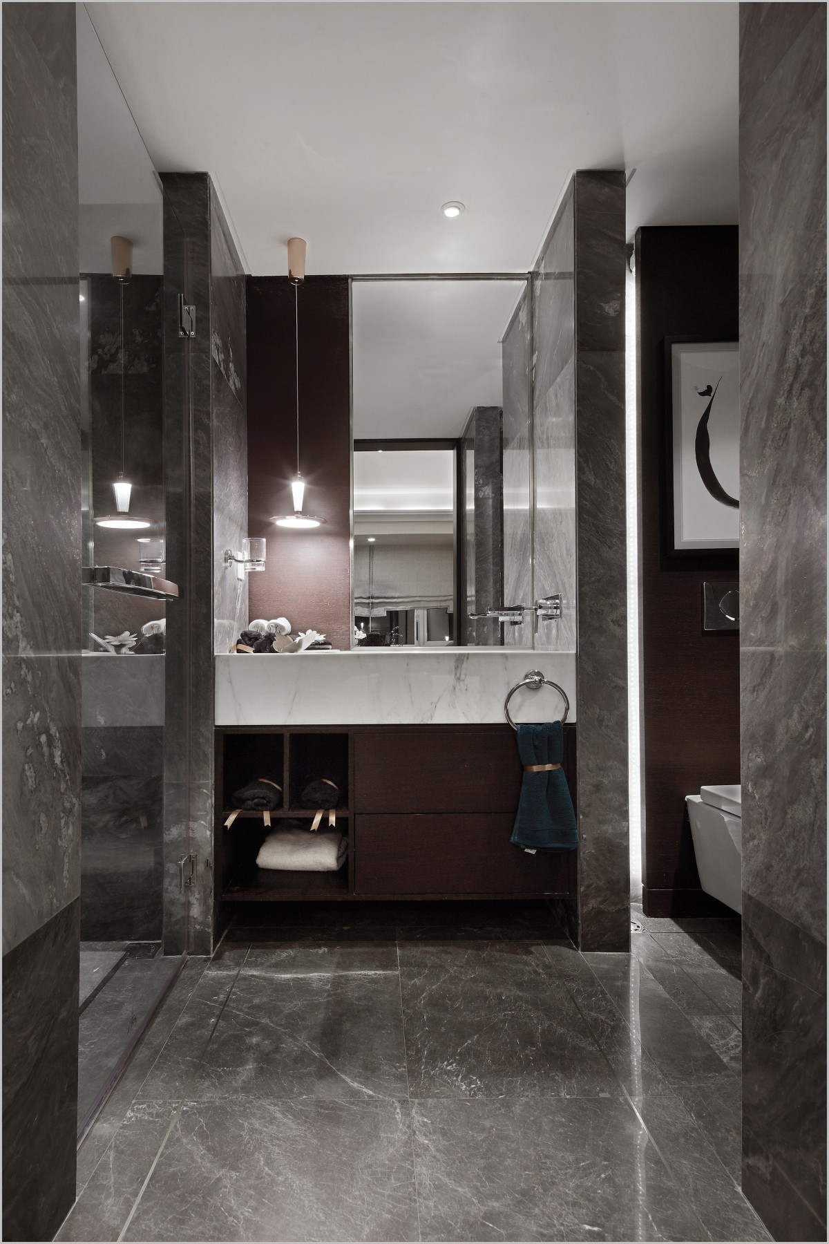 深沉的木饰、高级灰的大理石结合在一起,灯光的巧用,时尚不失古韵。