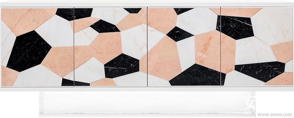 运用最新技术,Fractal边柜将大理石以几何图案的形式拼接,创造出全新的纹样。