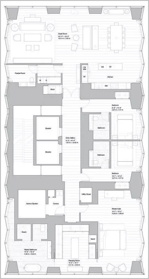 东53街100号让福斯特建筑事务所大展拳脚,完美结合内外设计理念.LOFT高挑公寓的建筑元素,如钻石抛光高强混凝土地板,生动还原了纽约下城的开放式生活空间,同时表现出当代奢华文化的原始结构主义。高层住宅的豪华配置及精湛工艺灵感源于其中的浩瀚景观和典雅布局独具匠心。的全部94户住宅,完美满足都市人群的多元需求,无论家庭成员人数多少,偏好何种生活休闲方式,都可在此找到理想居所。整个户型通透明亮,自然采光充足,专门预留艺术品陈列空间,打造舒适现代生活。