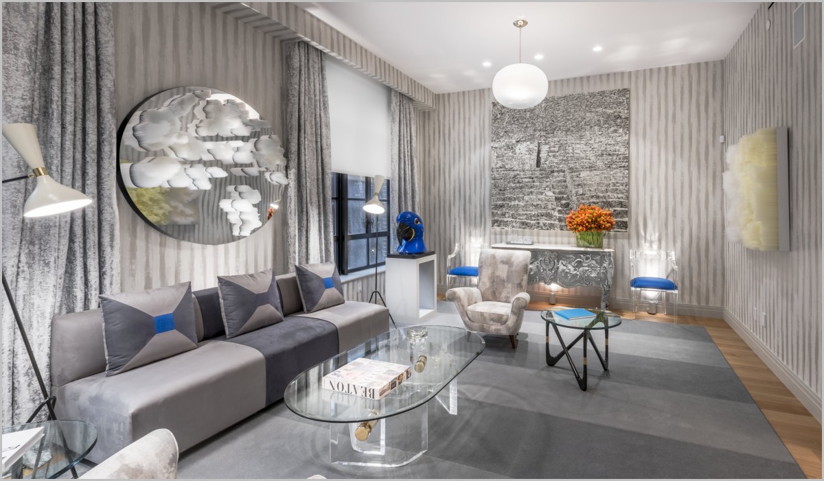 ▲Bradfield + Tobin Bradfield + Tobin的客厅被想象为一个年轻艺术收藏家的休闲空间。各种各样的现代和经典的家具和漆面条纹的壁纸,在柔和的色调以Jean-Marie Fiori,Hugo Vastidas和Francesca Pasquali的艺术品为背景。