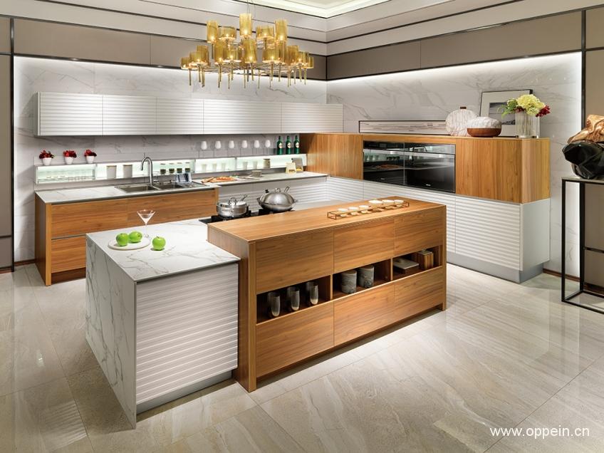 厨房墙面为了很好的防水和油烟清理,大都会铺贴墙砖来装饰。厨房墙砖与吊顶、乳胶漆墙面分隔开,这就要说到墙砖的收口了。接下来分享的5款开放式厨房墙砖收口效果图,这就一起来看看吧。