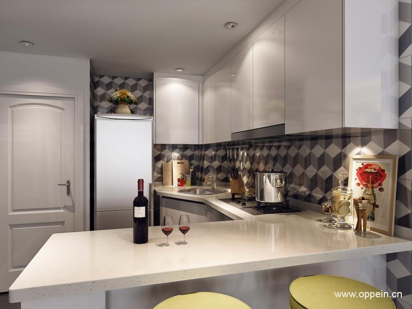 这款开放式厨房采用一字型设计,巧妙利用墙面空间,面积虽小,但地柜吊柜结合也增加了不少收纳空间。开放式厨房墙砖收口两边分别于墙面和柜体相接,墙面马赛克砖上方与白色吊顶相连,相互融合,又隔断分开,整体美观和谐。