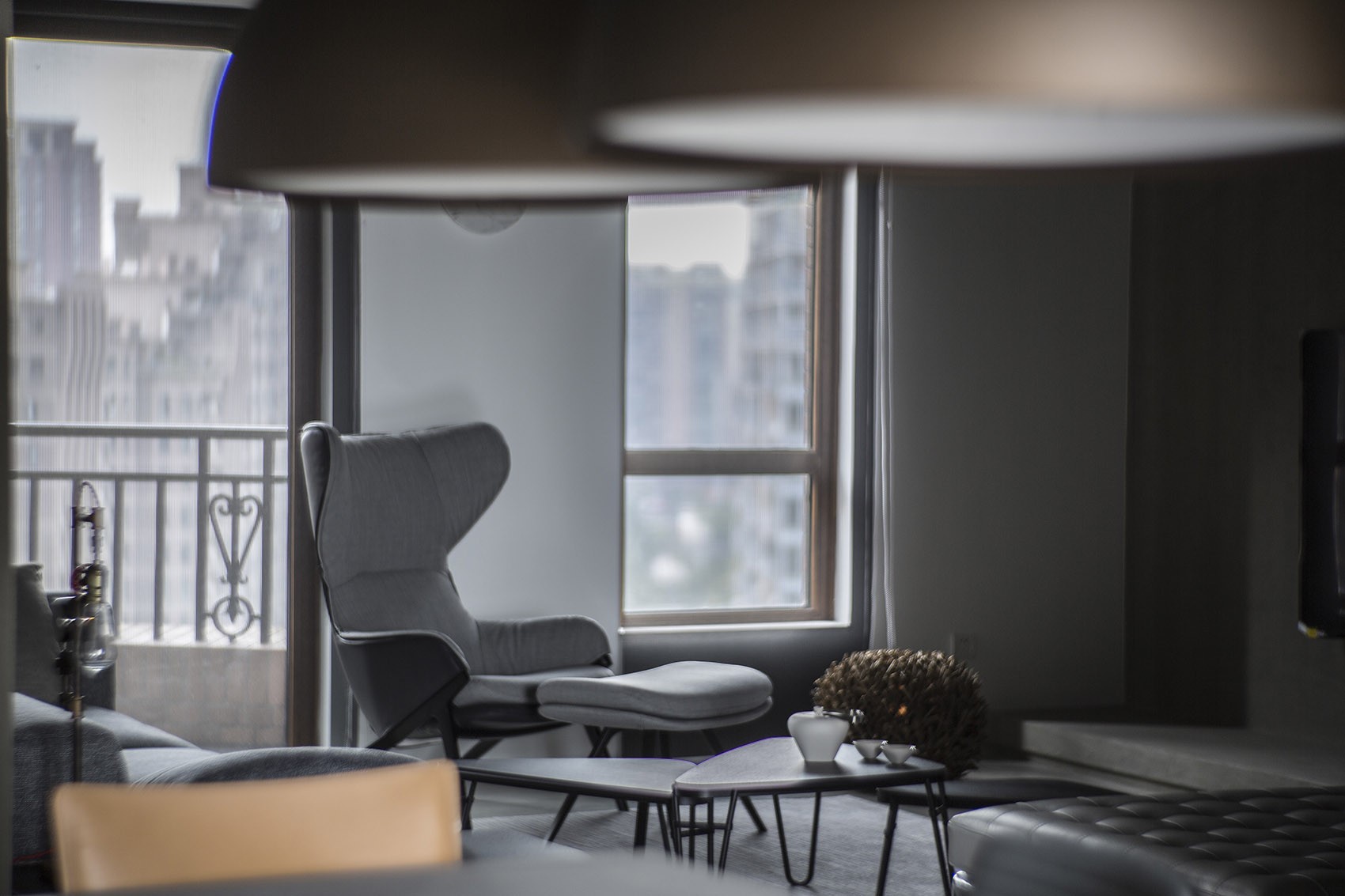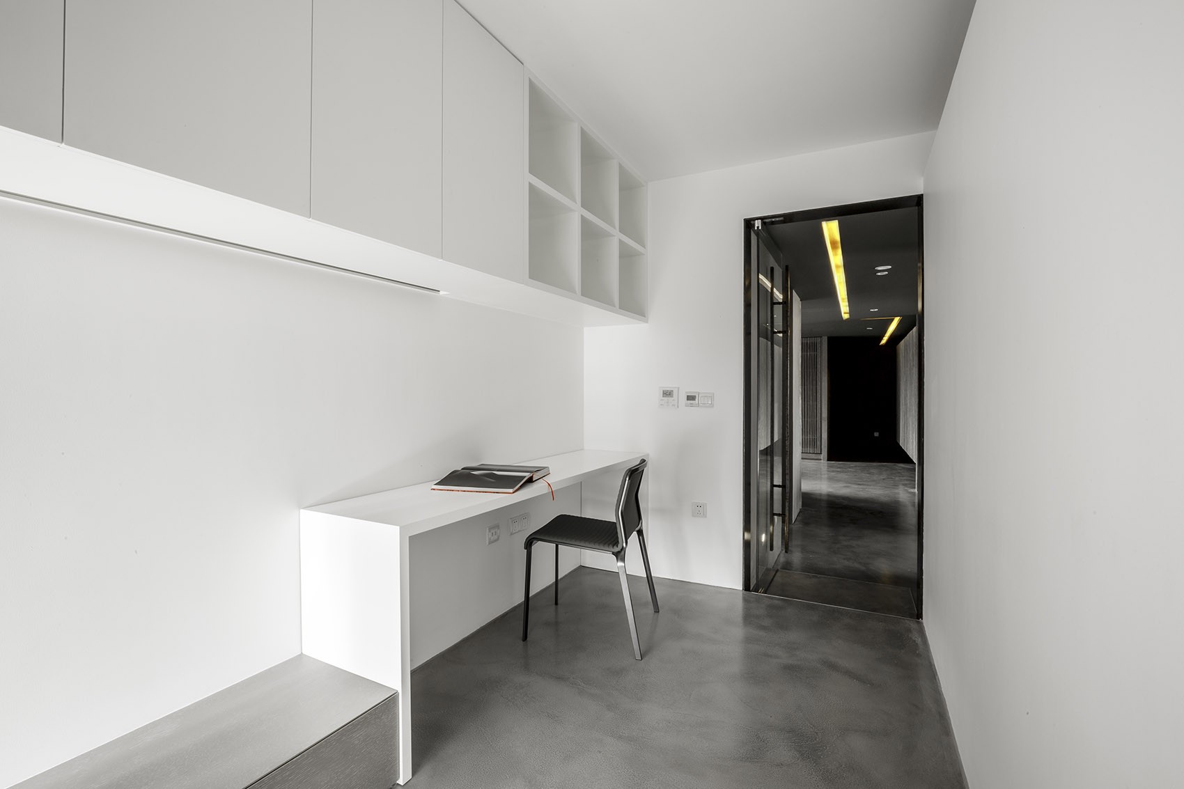 灰色调为主的开放空间,运用特殊水泥、青砖、pandomo、木皮染灰、生铁等低彩度、低明度材质。探讨材质特性,使其交迭运用,呈现静的氛围,多层次的空间。 红色,雀跃着生活及生命的热忱,融合于无彩度的灰色色阶里,即使区域分际模糊,在它眼前也能感受宁静与热情共生并存的和谐氛围。 光,隐藏于场域里,属于动力的来源,牵动感官感知意象与叙述。从虚实色相间彼此循环,构成相生共存的涵构程序,空间透过光线传递形象与影廓,在层次、律动、通透之间,光影依随着时序,不断变化,形构的轨迹也成为居住的生活画面,具人文温度且适得其所。