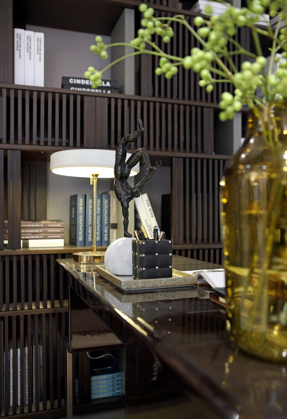 ▼书房以胡桃木纹格栅作为书架的装饰,搭配设计线条简约的书桌、还有现代气息强烈的装饰挂画,东西方元素和谐共融.