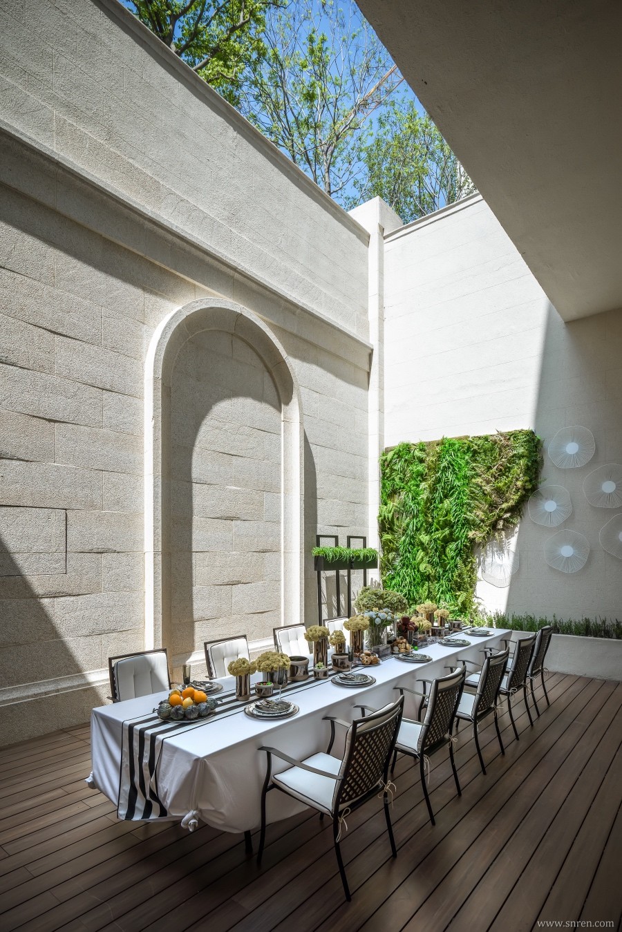 配合着极简的设计构思,餐厅室内空间设计在材质的铺陈和搭配上表达了现代设计的特质,祖母绿的餐具与精致的花艺点缀于餐桌上,使得空间层次分明。