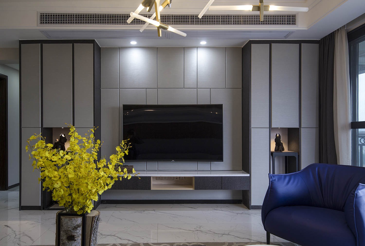 客厅整体硬装色调,用黑白灰做主色调,软装延续起基调色,在家具的色彩上做了局部变化。