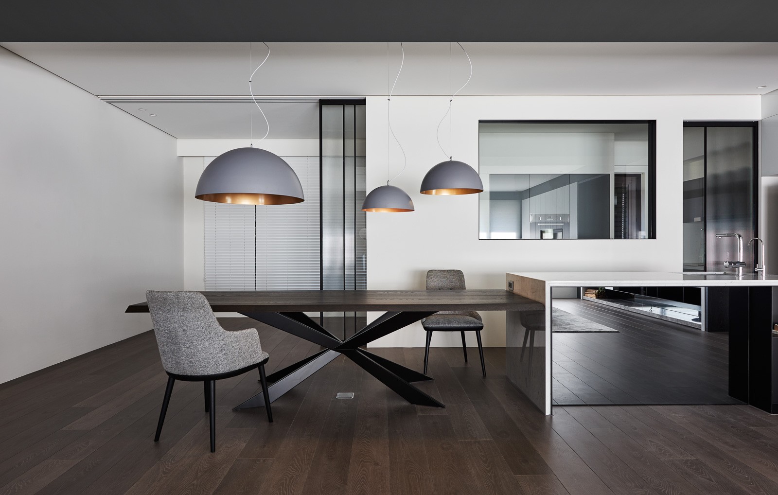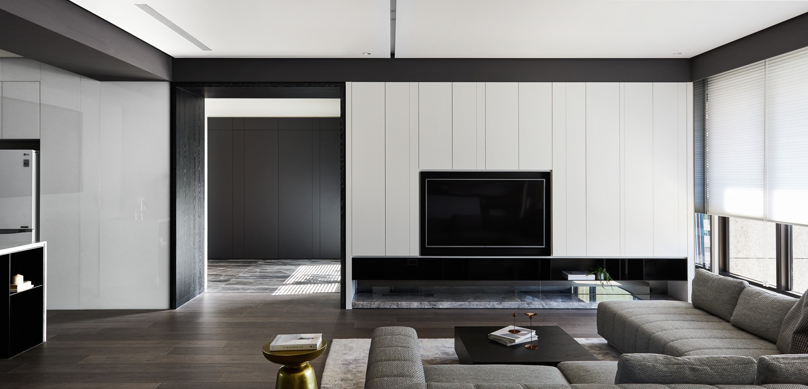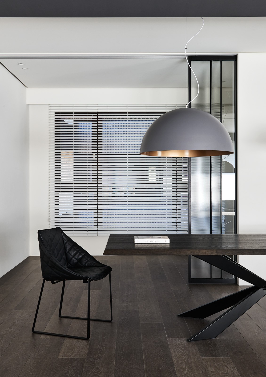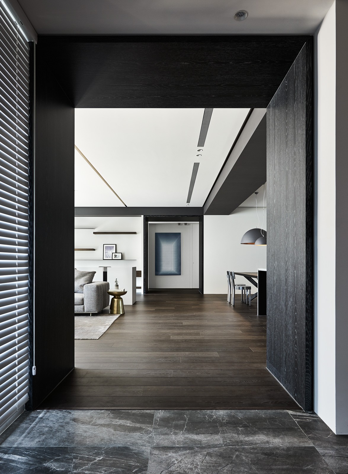 ——————————————————————————————— 地點:台北林口 屋況:新成屋 坪數:86坪 格局:一廳三房四衛 成員:夫妻二人與三個小孩 主要建材:木皮、系統櫃、橡木、灰鏡、噴漆、磁磚、鍍鈦 ——————————————————————————————— 在黑與白、框與景之間穿梭,運用空間中光影層次的交疊,還原材質本身純粹的肌理和質感。試將過度的綴飾降至最低比例,透過「虛實三進」的設計手法,讓空間更為內斂、自省,而不著痕跡地去引導和延伸人的視線,進而細細品味室外景致投射至室內的美景。空間化繁為簡,單純卻不失去韻味,創造出一框即一景的生活場域。 屋主需求: 1. 減少空間的區隔、多餘的動線 2. 希望能結合餐廚區 3. 重視採光 此案屋主劉先生從事餐飲貿易,一家五口原本旅居澳洲。搬回台灣後,期待將原本居住地域強調自然與單純的生活方式帶到新的住處。福樺謙邸位於新北市的林口,周遭圍繞公園綠意,建築本身在戶與戶之間創造了清楚獨立的劃分,高樓層的位置也帶進豐富的天光。有鑒於這些考量,設計師以「虛實三進」的概念,完成這個強調意境的居家空間。