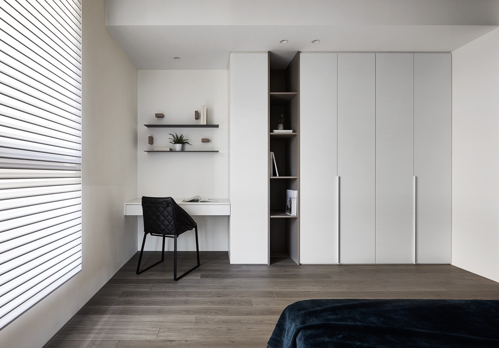▲ 私領域 – 長女房 就讀國中的長女,已是小大人的年紀。淺灰色、卡其色和原木地板的組合,中性卻優雅的帶出空間的氣質。床頭木製造型層版和隱藏門,與主臥的風格彼此呼應。但系統櫃和書桌卻更講究利落的造型,為空間帶來年輕的生氣。