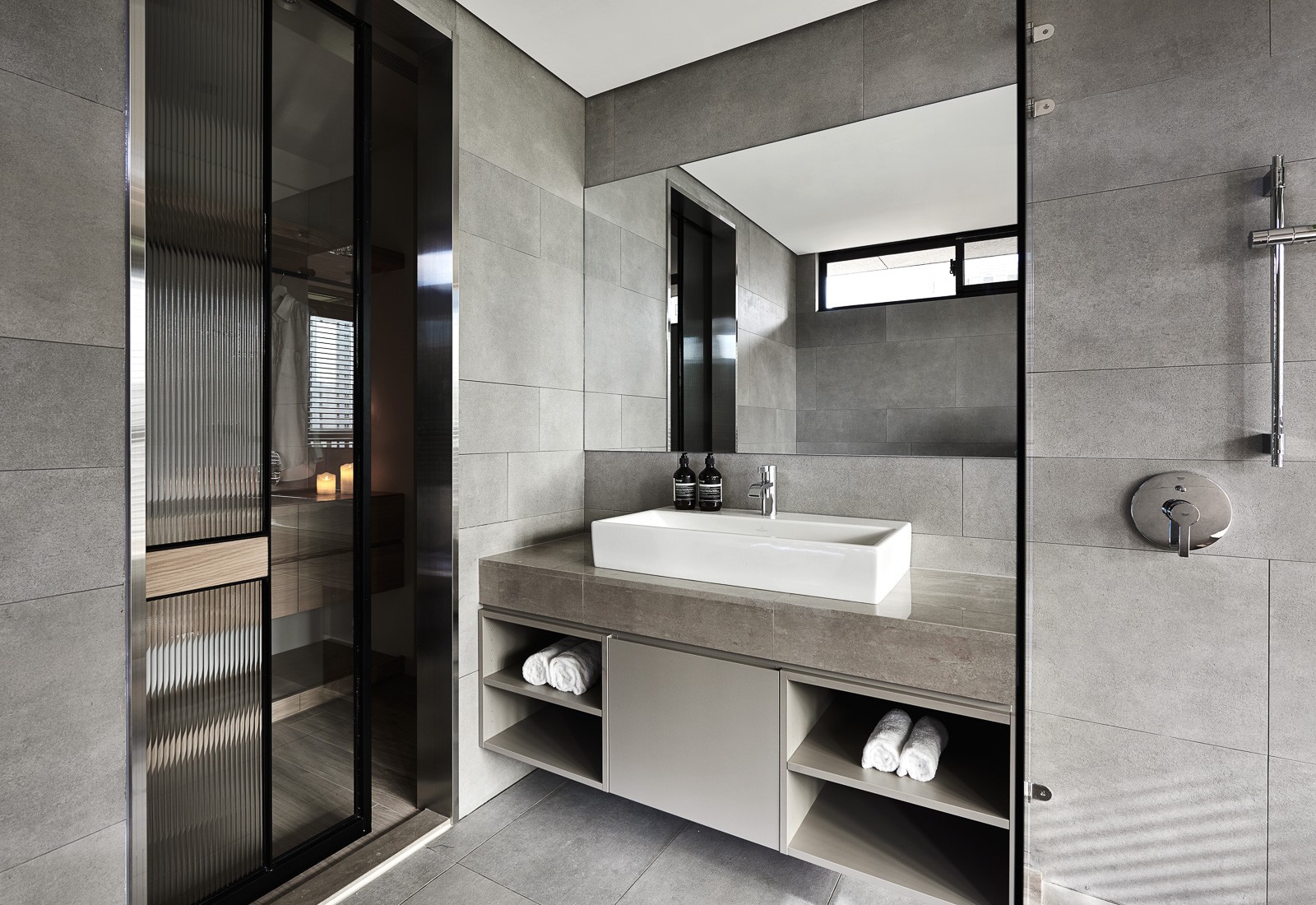 主臥浴室鋪以磁磚,回到沈穩的灰階色彩打理層次,讓每次沐浴更能達到靜心的效果。由鋁百葉空間穿透而入的光影效果,又與屋內其他地帶不同,線條平整、自成一格,卻不銳利。