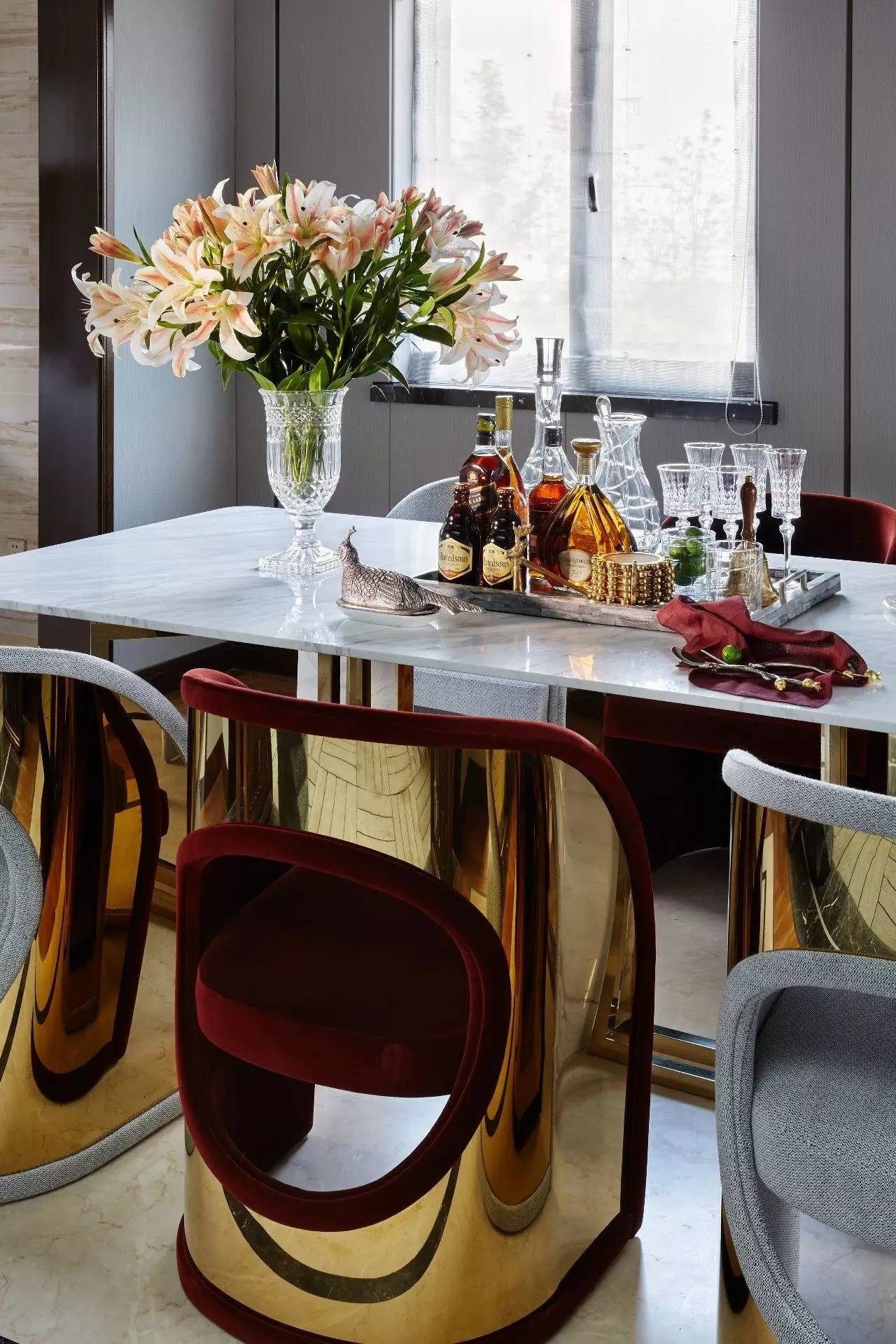 餐厅中不同材料的运用和叠加,金属圆弧后背的餐椅与圆形天然水晶吊灯相呼应,餐桌上的酒具仿佛在等待party的开始,极具情调。通透的空间环境,给人良好的感官体验,流畅的线条与自然的材质相辅相成,在体现自然质感的同时不失摩登现代气息。
