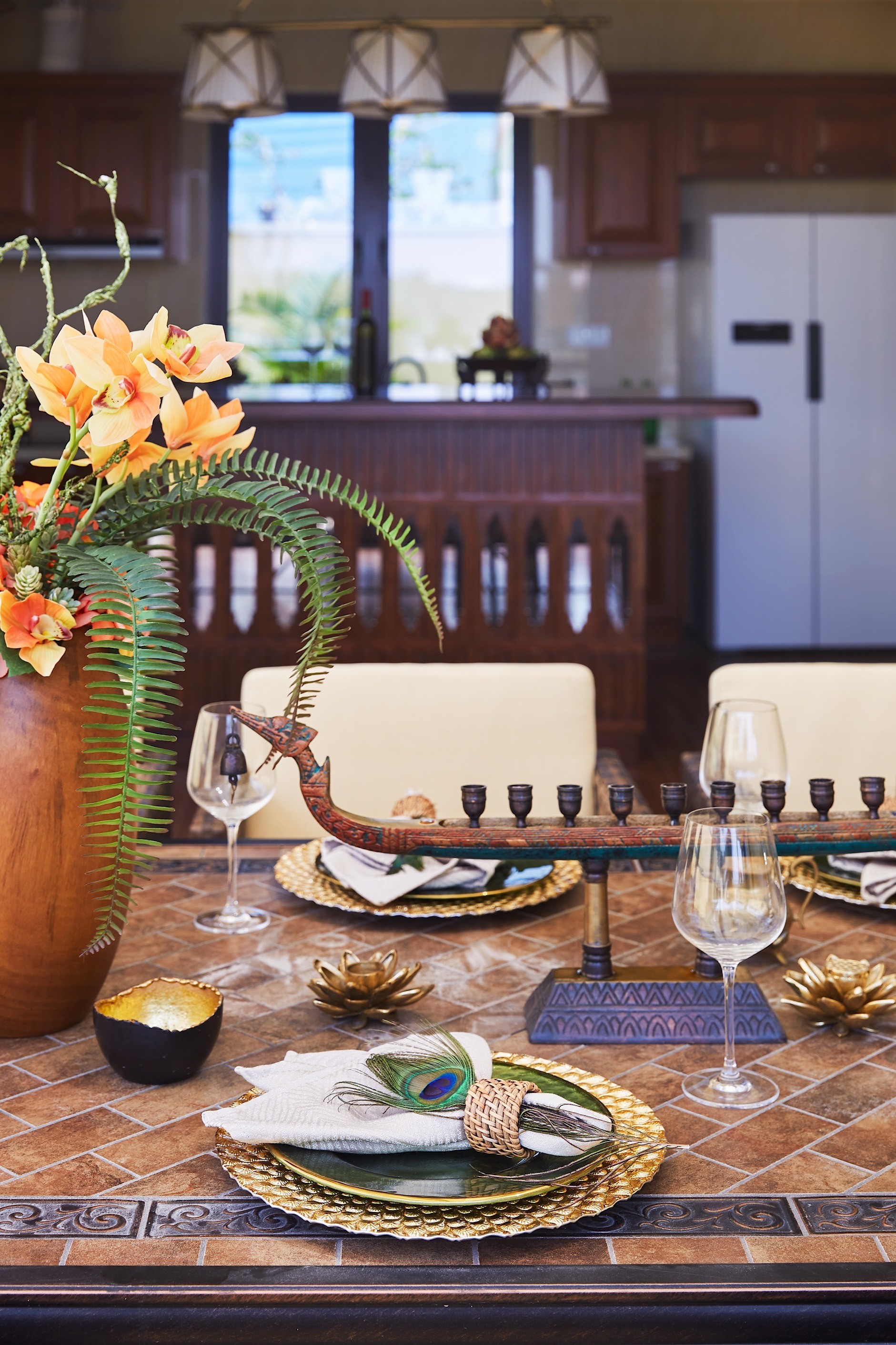 餐厅在配饰搭配上,为了更显文化的融合与碰撞,还专为这个空间设计了餐桌、餐椅,将东南亚岛屿风情的设计元素与三亚当地自然人文元素结合在家具上,从色彩上又不失当代生活味道。整个空间的元素搭配,似乎每个装置,每个装饰语言,都在互相说话。
