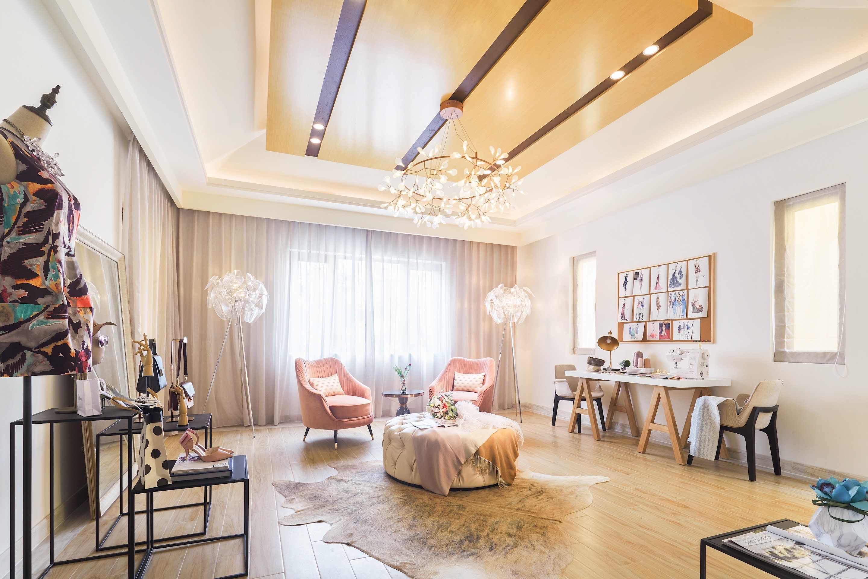 以优雅的米色搭配恬静的紫色,金属的质感在边几与缤纷花瓣金属吊灯之间遥相呼应。沙色与象牙白纱组合的窗帘,在微风下细细撩动,能否装下谁的一帘幽梦。 ▼