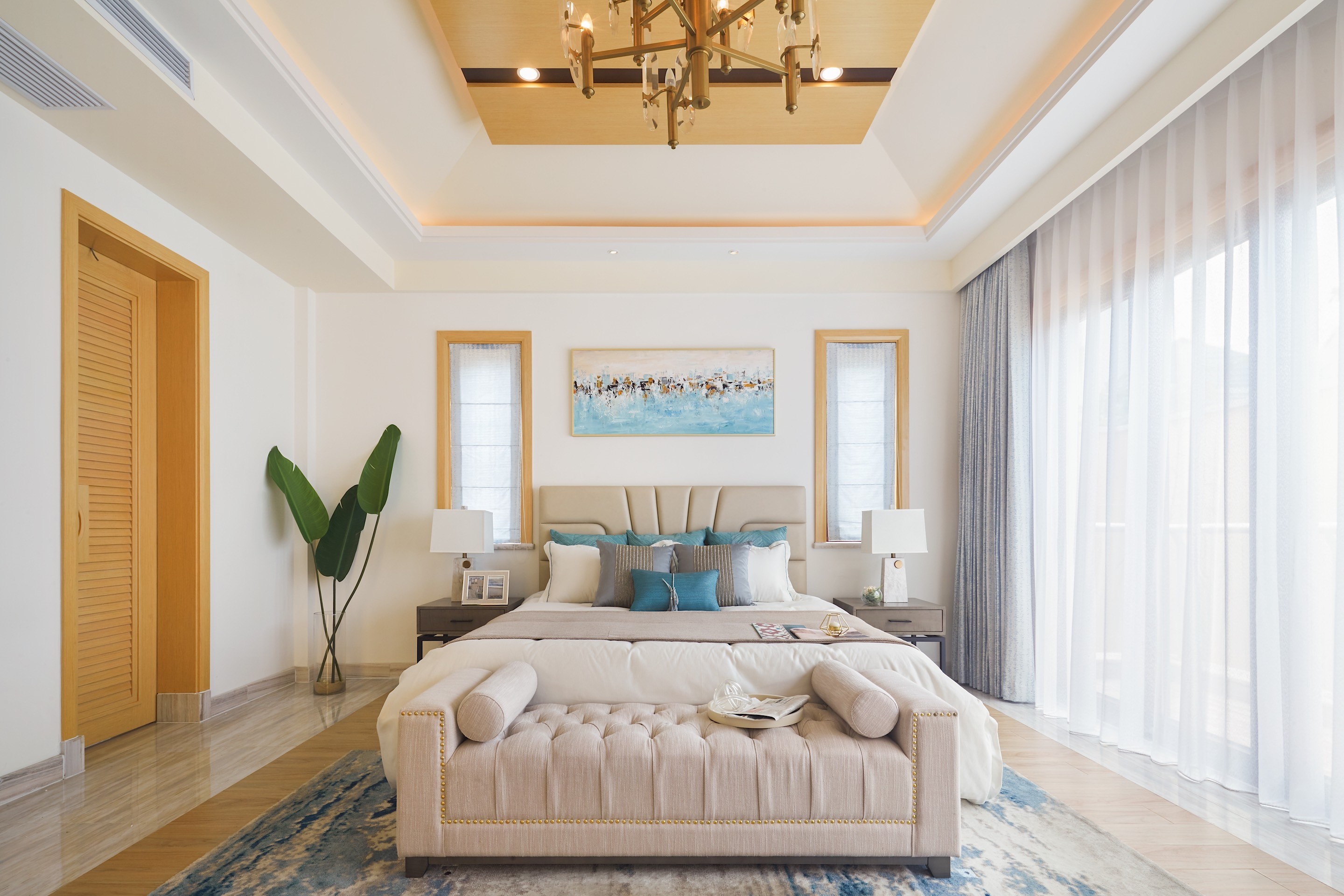 在主卧色调控制上,以Burberry 经典的米色为主色调,加入了深邃的海洋蓝。在舒适和极具艺术气息的空间中,提取了几何金属元素的质感的家具与电影场景般的质感,与地面羊毛波纹的地毯,来自凯莉赫本设计灵感的经典沙发 形成丰富的艺术精神世界,温柔的海风从海边吹过,抚摸着纱帘,将漫天的繁星安放在宁静的夜晚里。 ▼