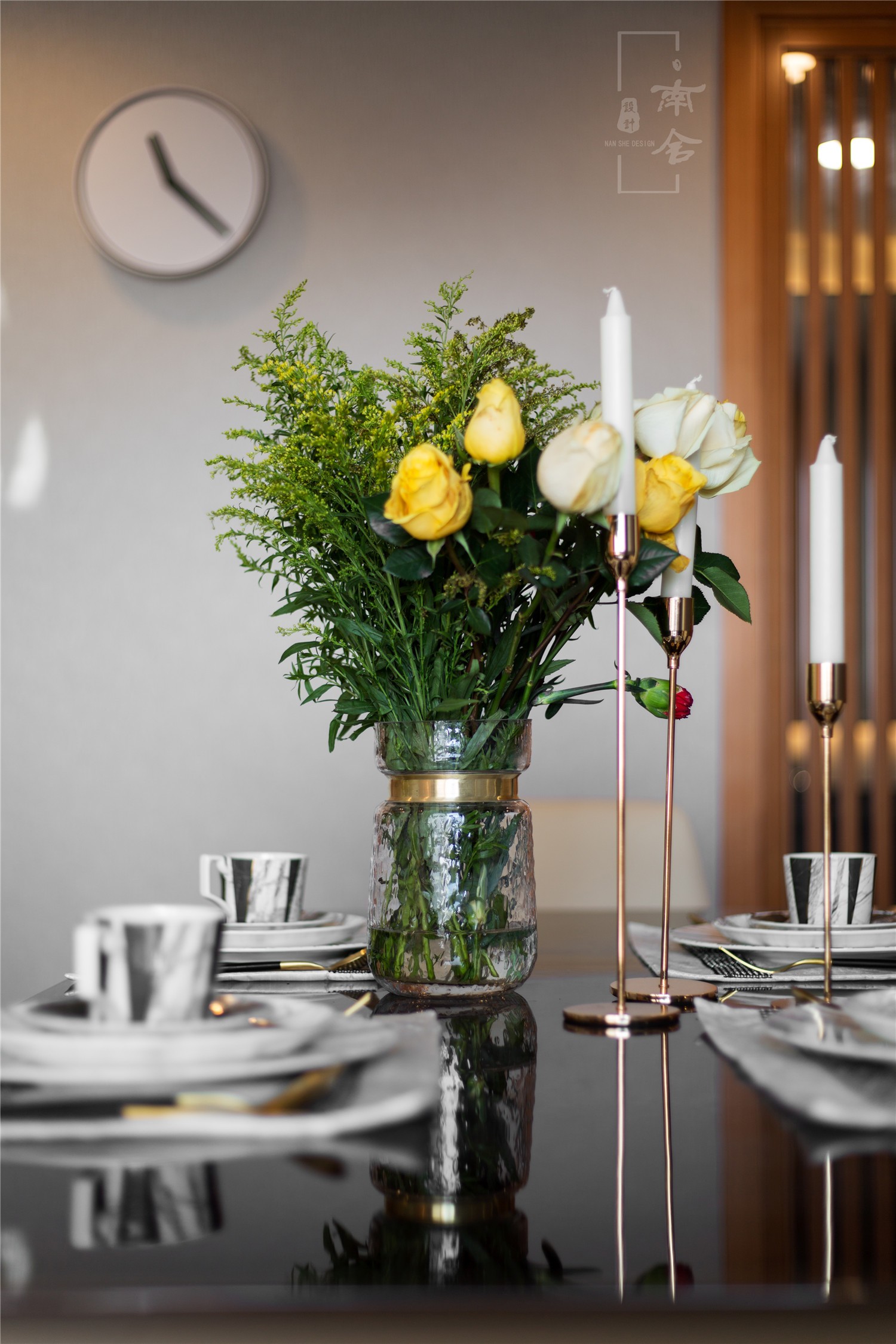 金色的餐具花瓶烛台贴合整个空间的气质,来自设计师选购。