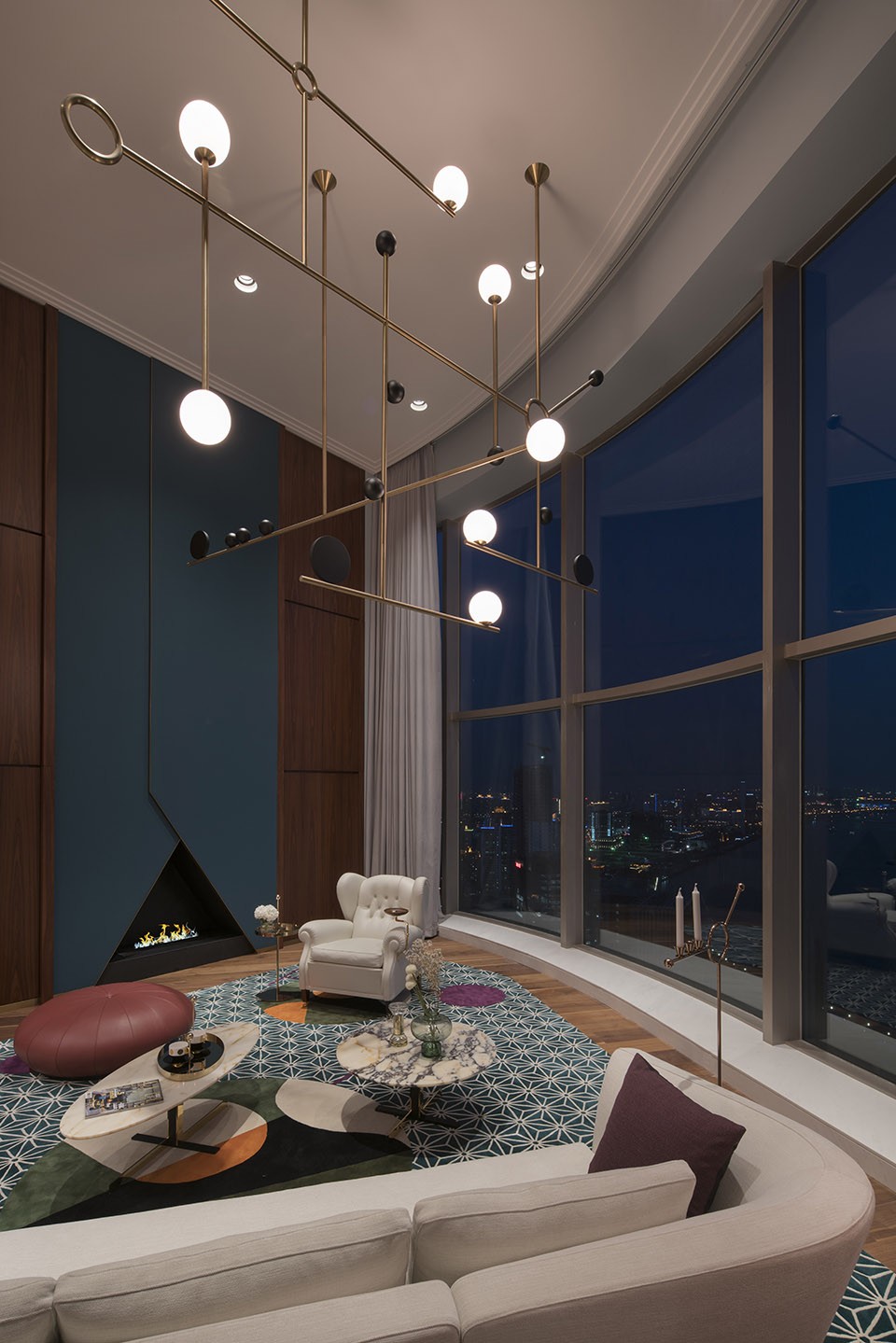 作为主入口,第二层则极大地满足了业主未来的会客需要。 双层挑高的客厅空间,凸显出建筑结构和现代感,偌大的落地窗让浦江风景尽收眼底,也最大程度的吸收了采光。顶上的吊灯为 Thomas Dariel 设计为巨型金属烛台造型,不受拘束的结构,自由大胆的线条,宛若艺术品一般悬浮在空中,体现出装饰艺术的高雅。客厅,应当彰显的是主人非凡的品味。 Thomas 从业主的喜好入手,从服装的剪裁中汲取了对壁炉的设计灵感,而另一侧的墙面的定制雕花又迎合了男主人对中式元素的偏爱,为这一原本极具艺术气息的空间,融入了鲜明的个人色彩。