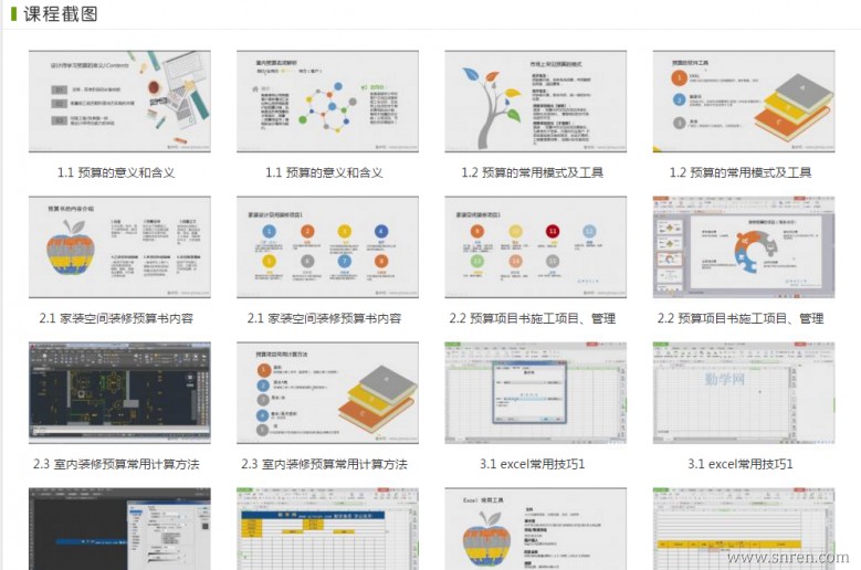 整套课程通过丰富的案例演示,由浅入深,以能实战就业为导向,给大家讲解了室内装修预算的技巧和方法,是一套适合从基础到精通的室内装修预算的系统教程。希望大家在学习的时候,通过不断的联系和思考,来提高自己,拓展思路,提高操作技能。 [attach]365330[/attach] 本套课程共分为四个章节: 第一章节:主要讲解学习室内装修预算的意义、预算的含义以及使用工具,通过这一章的学习,让大家熟悉、了解室内装修预算的概念。 第二章节:开始进入预算项目书的内容划分,首先从家装设计的空间来划分预算项目书的内容。然后通过施工项目、管理项目及服务项目深入学习一套完整预算项目书的内容。 第三章节:主要是预算必学软件工具——excel的实用技能讲解,达到快速上手预算的实操。 第四章节:开始整体案例的学习,通过一个室内(家装)装修案例,来实战学习,包括地面工程预算、墙面工程预算、家具项目预算、墙漆油漆项目预算、水电防水工程预算等内容。 [attach]365331[/attach] [attach]365332[/attach] [attach]417820[/attach] [attach]417818[/attach] [attach]417821[/attach] [attach]417819[/attach] [attach]417822[/attach] 室内装修预算报价完全视频教程下载地址: