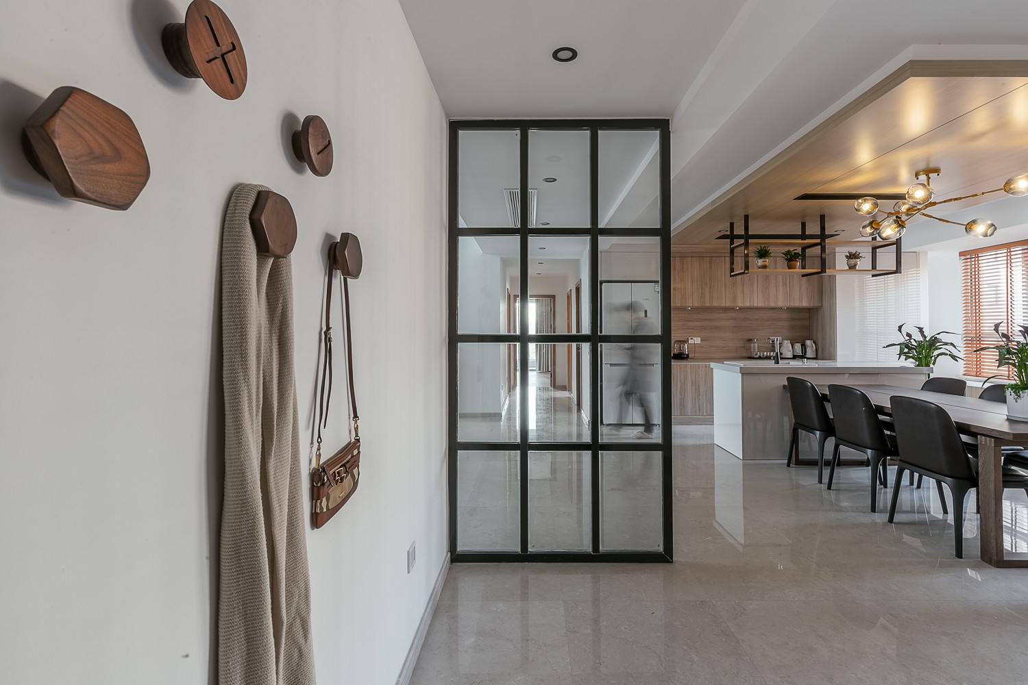 进门的走廊不宽,但到主卧有18米的距离。黑胡桃的挂衣钩可装饰可使用。