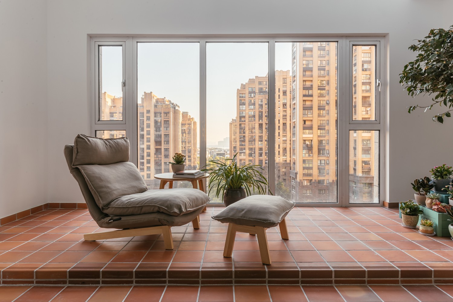 去掉客厅与阳台之间的玻璃门,两个踏步到达女主人的休闲之地,看书养花观太湖。 |