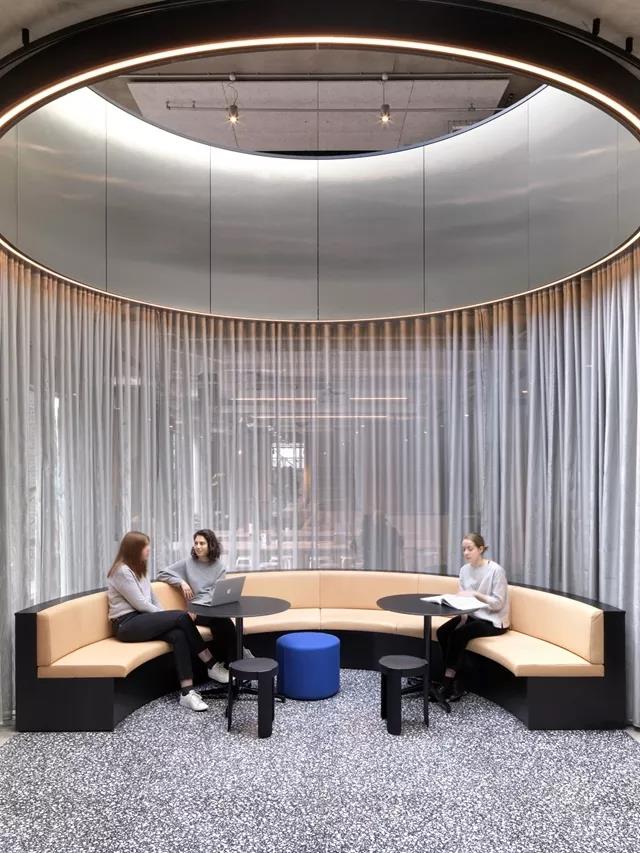 圆形半开放式的会议空间,沿着周边的落地玻璃窗排列着咖啡馆风格的长椅,