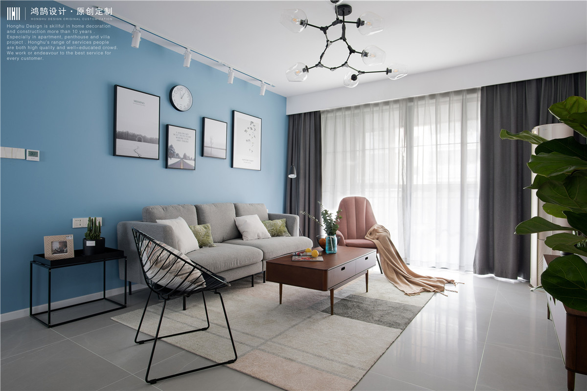 蓝色沙发背景墙和深灰色窗帘,及灰色沙发,既营造出了远离世俗的宁静,也丰富了空间的层次感。沙发背景墙上的装饰画,打破了背景的沉寂,显得更加简约时尚