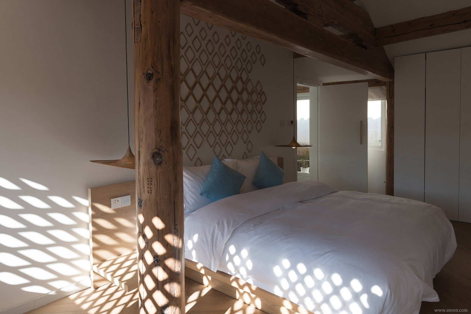 设计的另一挑战是在被要求的房间数量,现代生活的舒适性,古老的木结构与限定的空间之间取得良好的平衡。其结果是所有十一间客房的空间布局是完全不同的,使得每一间都有独特的使用体验。有些房间的浴缸拥有别致的景观,有些房间在传统的屋檐下有面水的室外休闲座,有些房间带有独立后院,竹林环绕……