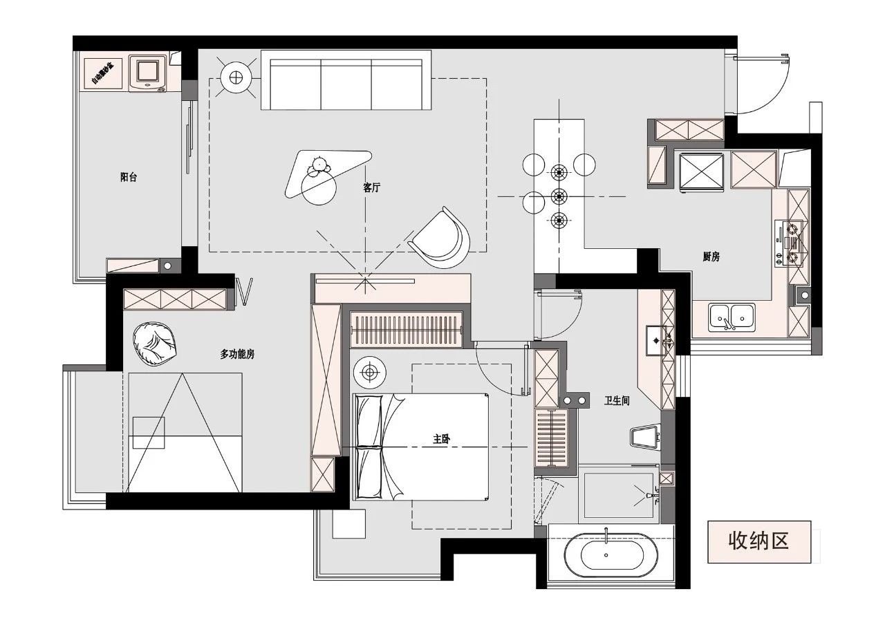 屋主不喜欢素净的空间,为达到平衡先用中性色打底。选择灰中带粉的墙面漆,有一点小别致。再用蓝色色块妆点空间。还有意减少了高柜的使用,保证视觉开阔。