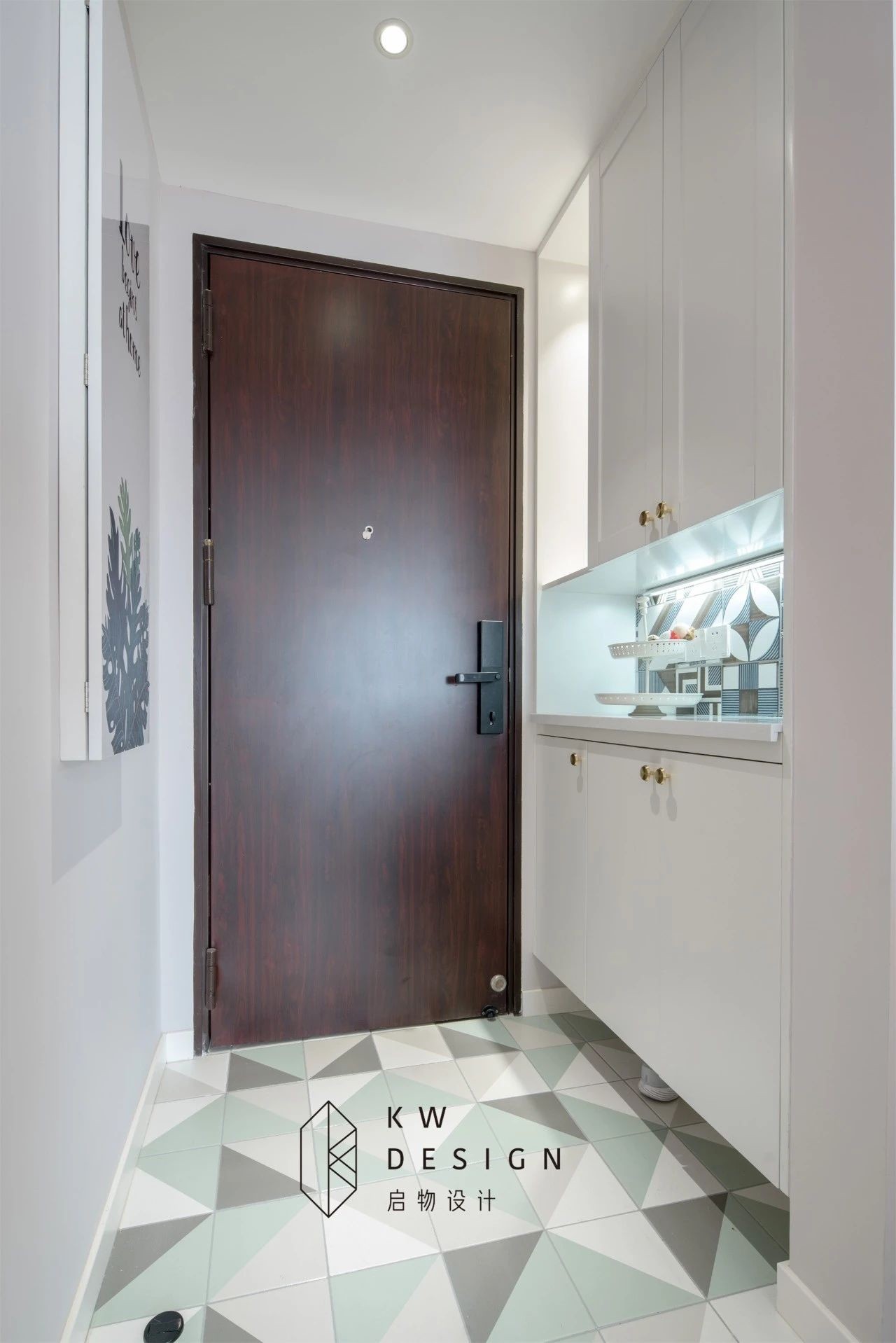 预算考量没有换掉大门,把普通门锁换成智能门锁。玄关贴上小花砖作为落尘区,有点小别致。用材质与室内的木地板做视觉分区。