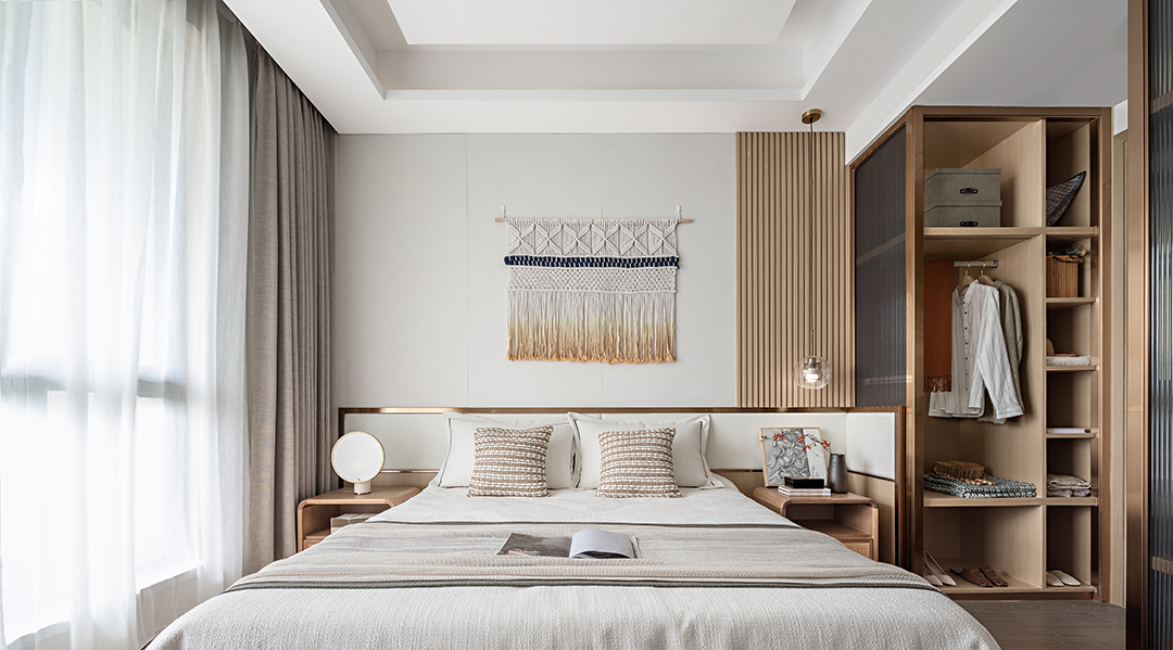 主卧空间,从休憩区到衣帽间,到干湿卫浴,起居动线便捷流畅。温润的原木家具+棉麻材质床品,搭配特色民族饰品,营造出温馨轻松的环境氛围。